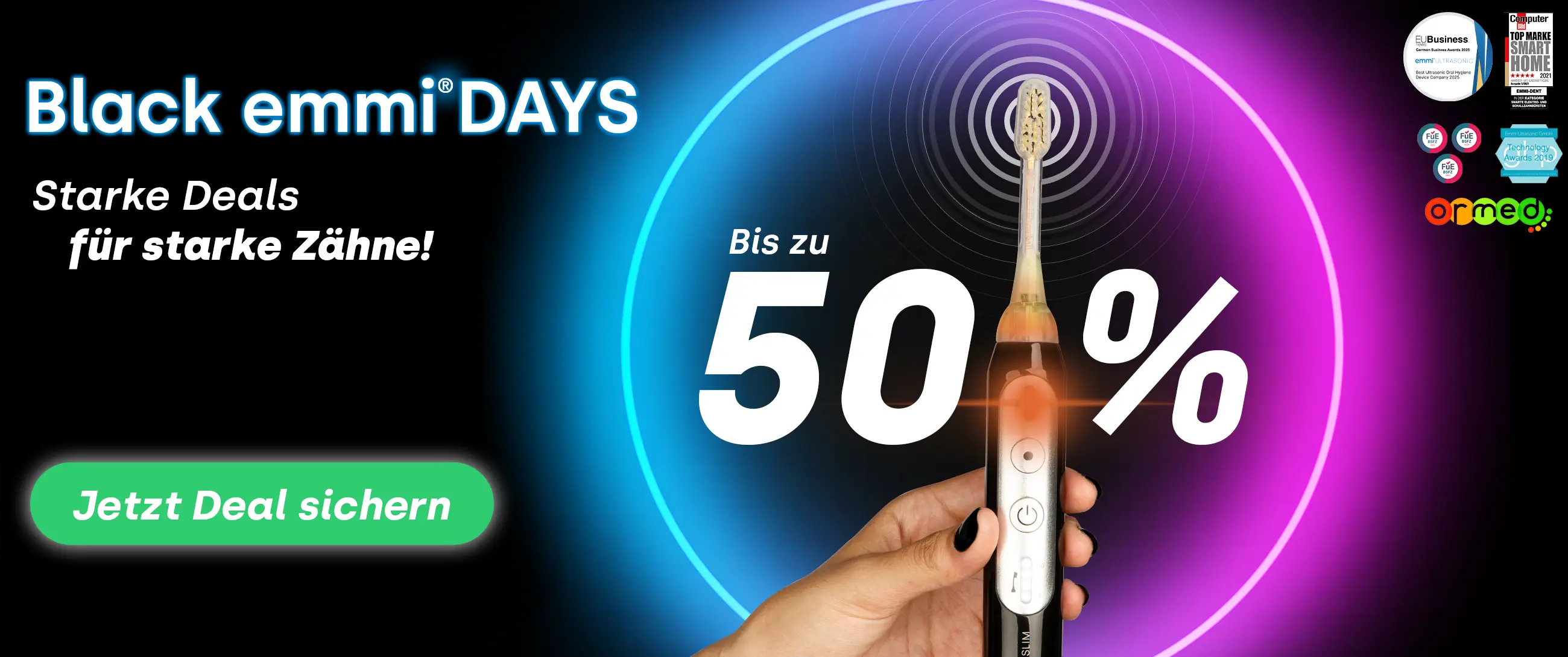 Der Wecker klingelt: Sie stehen auf, gehen ins Badezimmer, blicken in den Spiegel und beginnen mit Ihrer Morgenroutine. Zähneputzen gehört selbstverständlich dazu, doch oft ist es eine lästige Pflicht-Routine. Dabei gibt es eine sanfte und effiziente Alternative zur herkömmlichen Zahnbürste: Eine Ultraschallzahnbürste erleichtert Ihnen nicht nur die Zahnpflege, sondern sorgt auch für ein besonders gründliches und schonendes Reinigungsergebnis. Wissenschaftliche Erkenntnisse zeigen, dass Ultraschallzahnbürsten effektiver reinigen als herkömmliche Hand- oder elektrische Zahnbürsten – ganz ohne Druck oder schrubbende Bewegungen. emmi-dent bietet Ihnen eine innovative Ultraschallzahnbürste, die Ihre Zähne mit bis zu 96 Millionen Schwingungen pro Minute sanft, aber hocheffizient reinigt. Sie müssen keine besonderen Putztechniken beachten oder Druck ausüben – die Reinigung erfolgt berührungslos und besonders schonend. Verfärbungen durch Kaffee, Tee oder andere Genussmittel lassen sich mit Ultraschall effektiver entfernen, sodass Ihr Lächeln täglich in neuem Glanz erstrahlt.