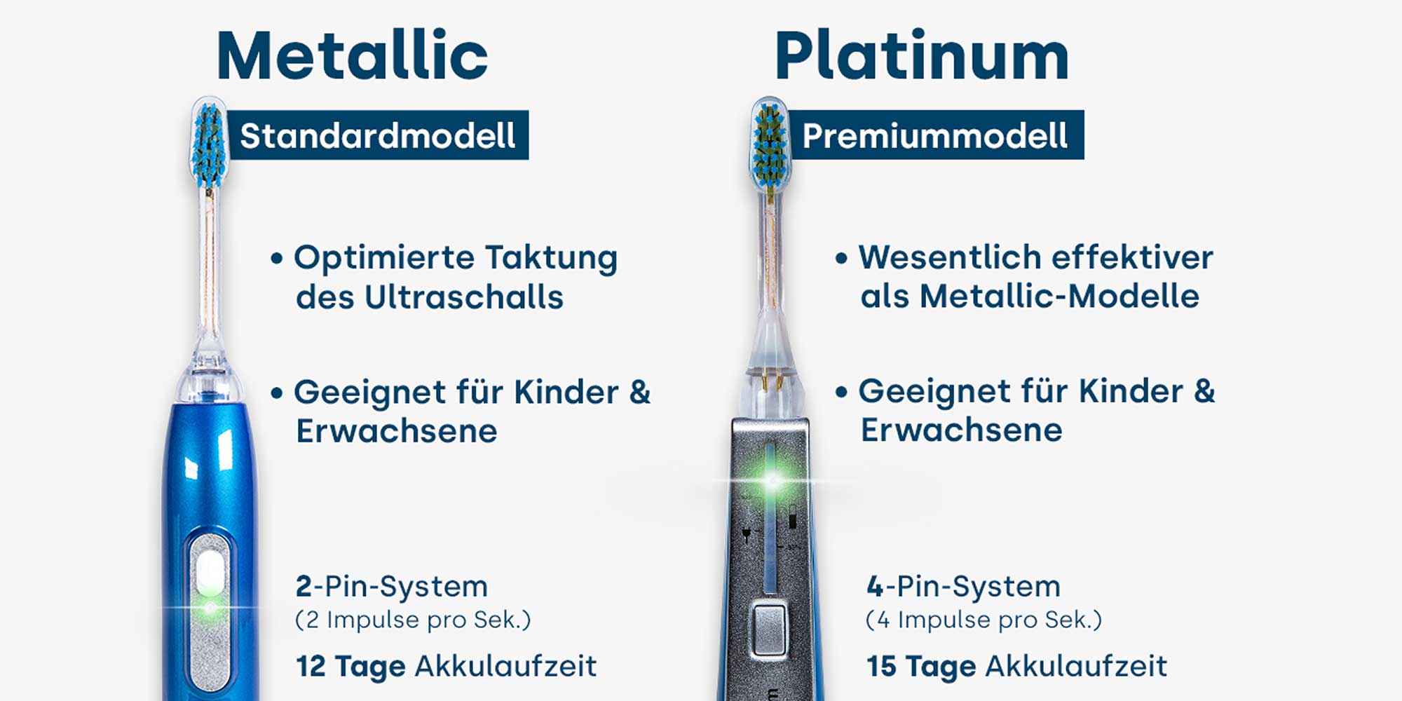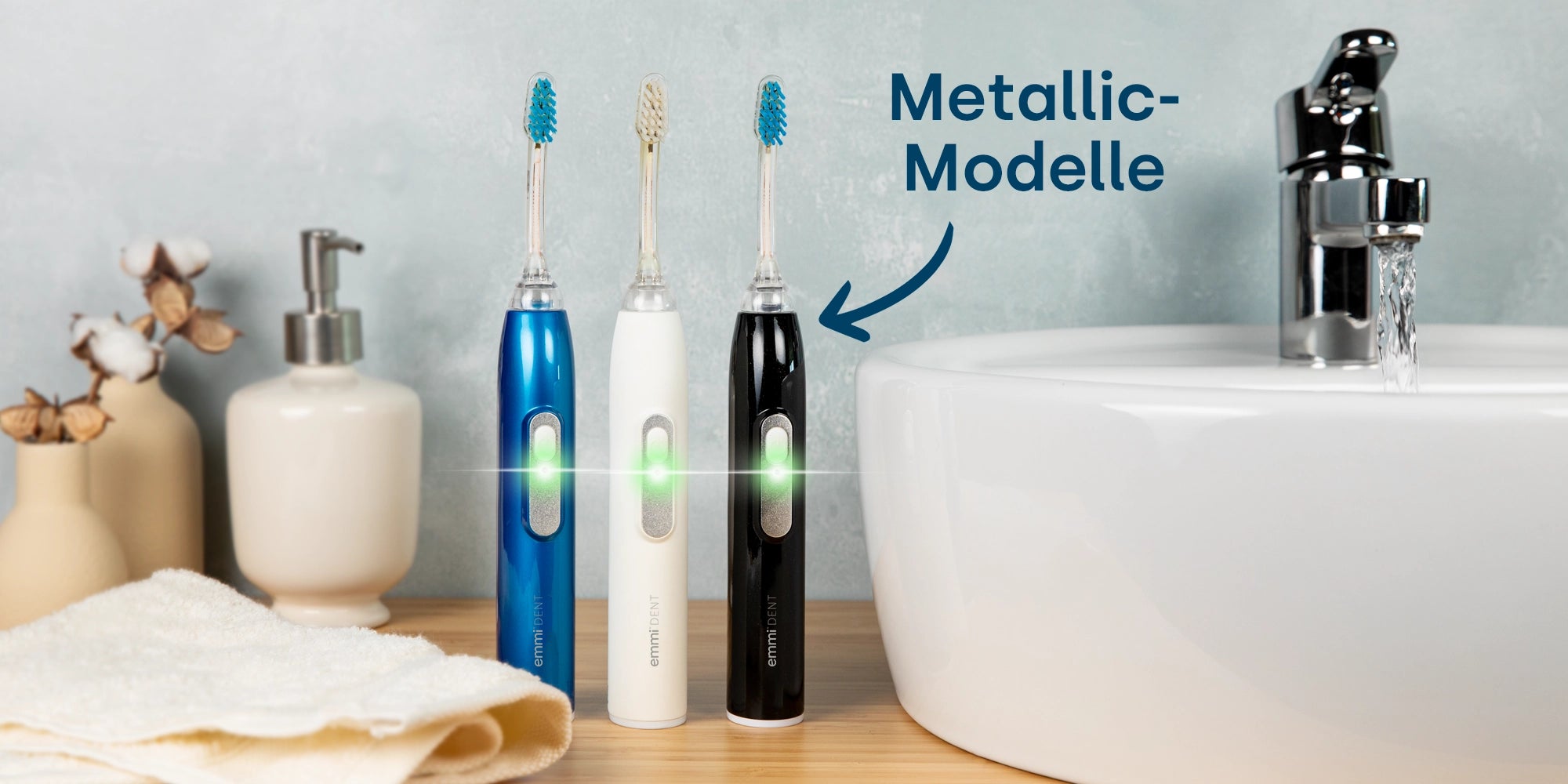 Die emmi-dent Ultraschallzahnbürste Metallic ist das Einsteigermodell der Ultraschallzahnbürsten mit einem 2-Pin System. Das bedeutet, dass das Metallic Modell pro Sekunde 2 Ultraschall-Impulse generiert und somit eine hochmoderne Ultraschallzahnbürste ist, die eine effektive und schonende Zahnpflege ermöglicht. Mit der emmi-dent Ultraschallzahnbürste Metallic investieren Sie in eine qualitativ hochwertige Zahnpflege zu einem fairen Preis.