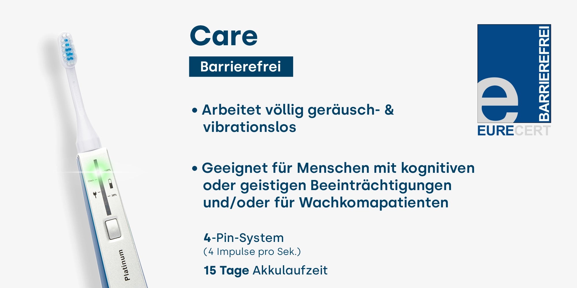 Bei emmi-dent Ultraschallzahnbürste Platinum Care handelt es sich nicht nur um ein weiteres Modell unserer emmi-dent Zahnbürstenfamilie, sondern vielmehr um die effiziente Weiterentwicklung unserer „Platinum“ Ultraschallzahnbürste; angepasst auf die Bedürfnisse bewegungseingeschränkter Menschen. Revolutionäres Zähneputzen verspricht unsere Ultraschallzahnbürste „Platinum Care“, durch das ihr erteilte Gütesiegel für Barrierefreiheit.