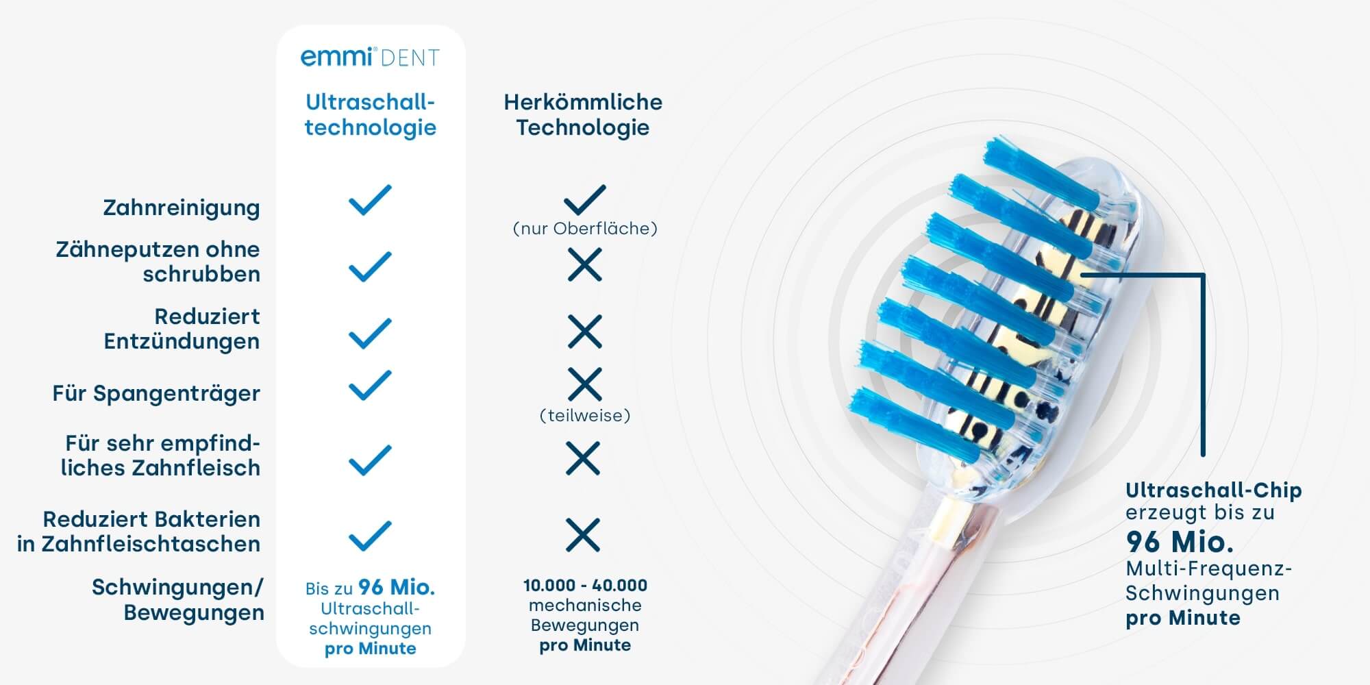 Obwohl Schallzahnbürsten eine Reinigungsleistung haben, bieten Ultraschallzahnbürsten eine intensivere Reinigungserfahrung ohne den Zahnschmelz anzugreifen. Die Frequenz der Ultraschallwellen ermöglichen es, dass Ultraschallzahnbürsten ohne mechanische Bewegungen auskommen als herkömmliche elektrische Zahnbürsten. Somit besteht keine Gefahr bei falscher Nutzung Ausversehen sich den Zahnschmelz "wegzuschrubben". Die ultraschnellen Schwingungen können tiefer in die Zahnzwischenräume und entlang des Zahnfleischrands eindringen, um Biofilm, Plaque und Bakterien effektiver zu entfernen.