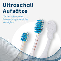 Ultraschall reduziert Bakterien, auch in Zahnfleischtaschen, reduziert Mundgeruch und erreicht auch schwer zugängliche Stellen wie Zahnzwischenräume. Dabei werden Bakterien nachhaltig reduziert, weshalb es sich optimal für Spangenträger und Implantate eignet.