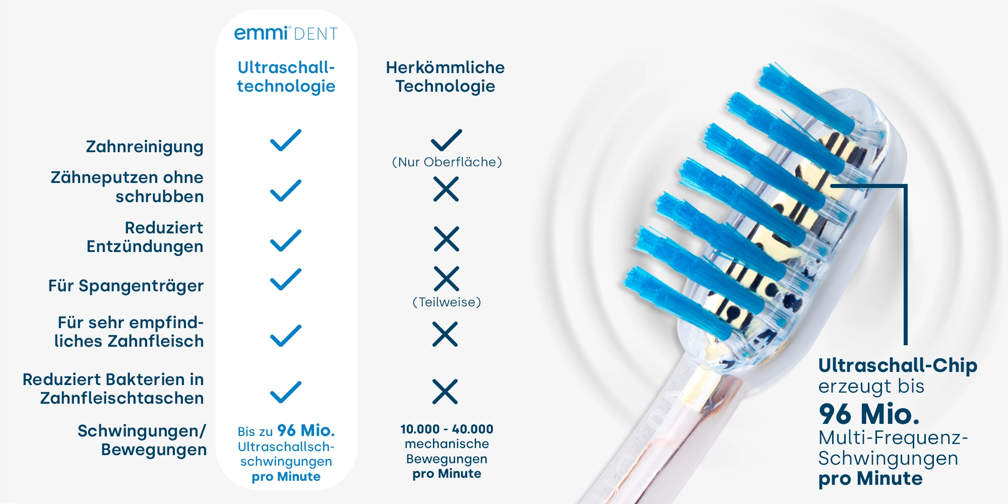 Der entscheidende Unterschied zu anderen Zahnbürsten liegt in der Art der Reinigung: Während elektrische Rotations- und Schallzahnbürsten mechanisch arbeiten und somit nur die Bereiche säubern, die sie physisch erreichen, bietet die Ultraschallzahnbürste von emmi-dent eine umfassende Reinigung des gesamten Mundraums. Und dies geschieht ganz ohne Druck, was eine sanfte und gründliche Pflege ermöglicht – Zahnfleischschonend und geeignet für sensible Zähne.