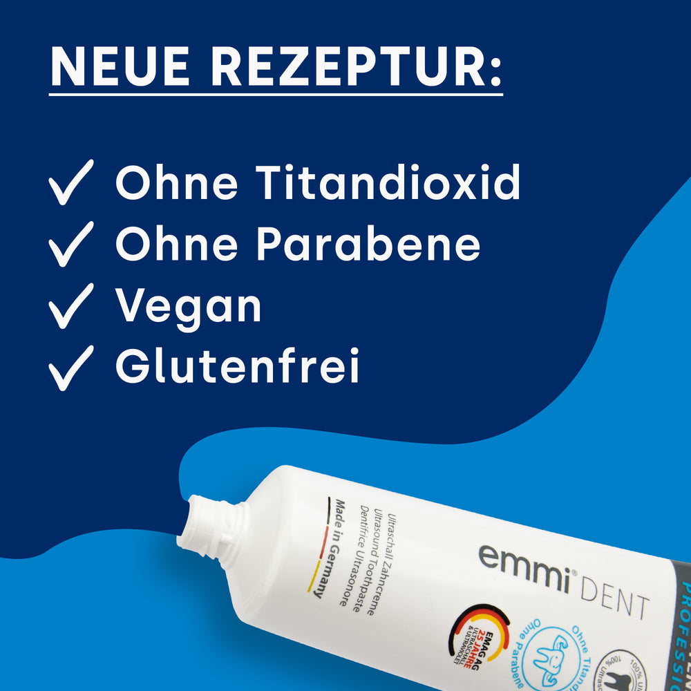 Entdecken Sie die verbesserte Welt der emmi-dent Whitening Zahnpasta – jetzt titandioxid- und parabenefrei! Erleben Sie die gleiche kraftvolle Whitening-Wirkung, jedoch mit einer noch natürlicheren Formel. Der Verzicht auf Titandioxid macht unsere Zahnpasta sanft und schonend, perfekt für strahlend weiße Zähne ohne Kompromisse. Genießen Sie das Beste aus natürlicher Zahnpflege und strahlendem Lächeln!