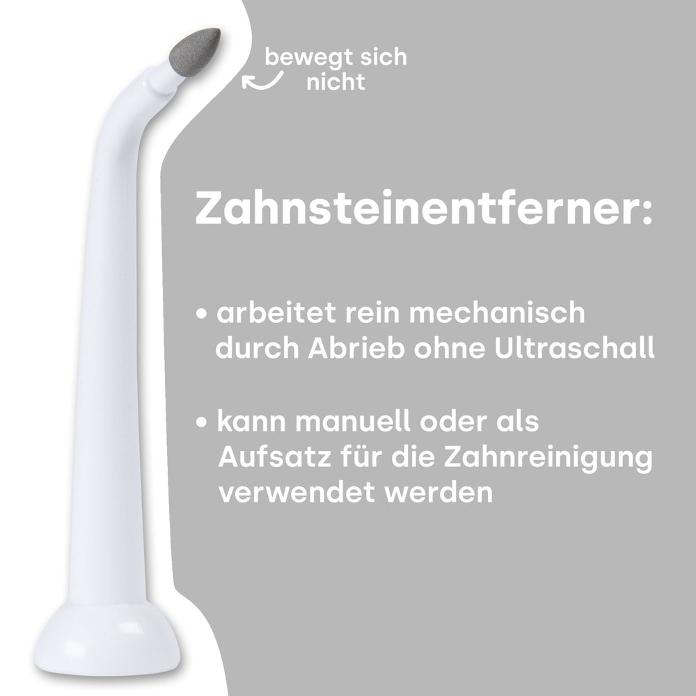 Der emmi Zahnsteinentferner kann manuell oder als Aufsatz für die Zahnreinigung verwendet werden. Er arbeitet rein mechanisch durch Abrieb ohne Ultraschall.