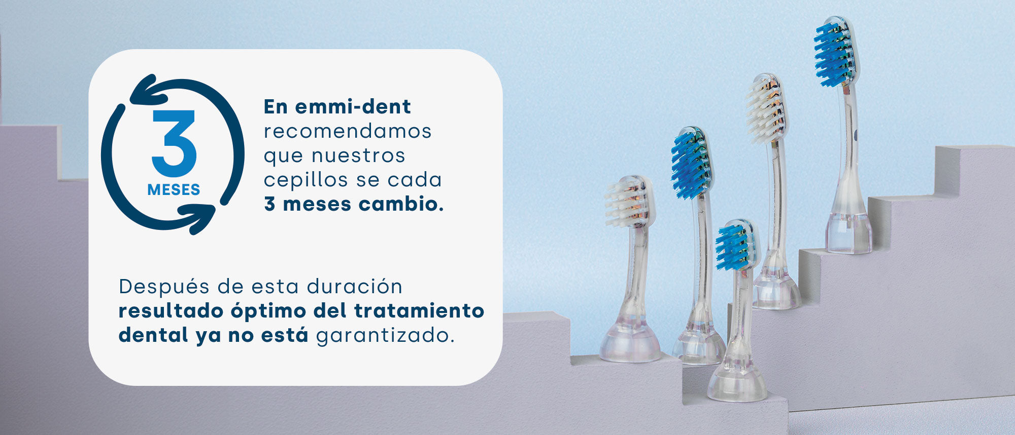 La vida útil de los cabezales de cepillo emmi-dent es de aproximadamente tres meses, ya que el uso diario reduce la capacidad de las cerdas para transmitir eficazmente el ultrasonido a los dientes. Para seguir garantizando la mejor limpieza dental e higiene bucal, se recomienda cambiar los cabezales del cepillo periódicamente. Esto garantiza un rendimiento alto y constante de su cepillo de dientes ultrasónico y protege su salud bucal.