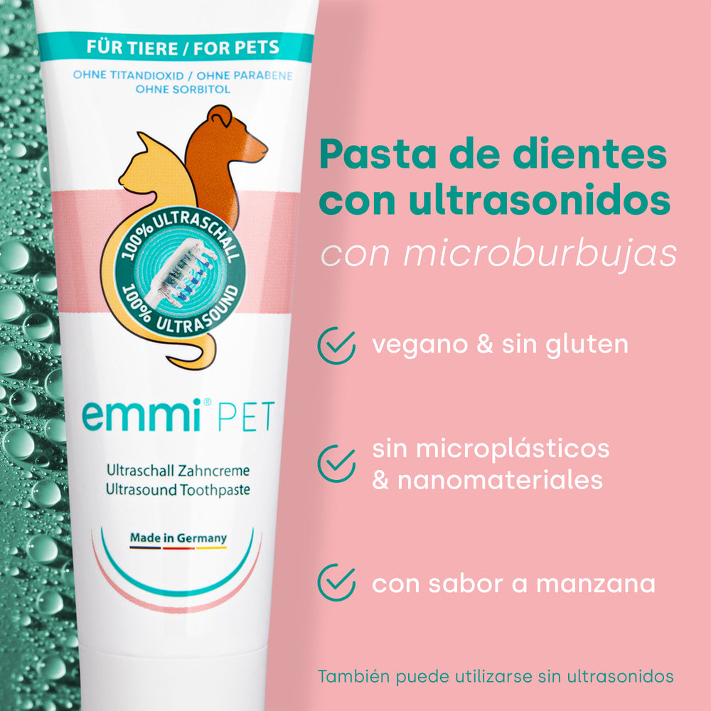 El set básico emmi-pet 2.0 es adecuado para todos los propietarios de mascotas que se preocupan personalmente por la salud y el cuidado de su amigo de cuatro patas. Este kit contiene todo lo que necesita para eliminar de forma suave, completa y sin dolor la placa y las bacterias de su mascota.