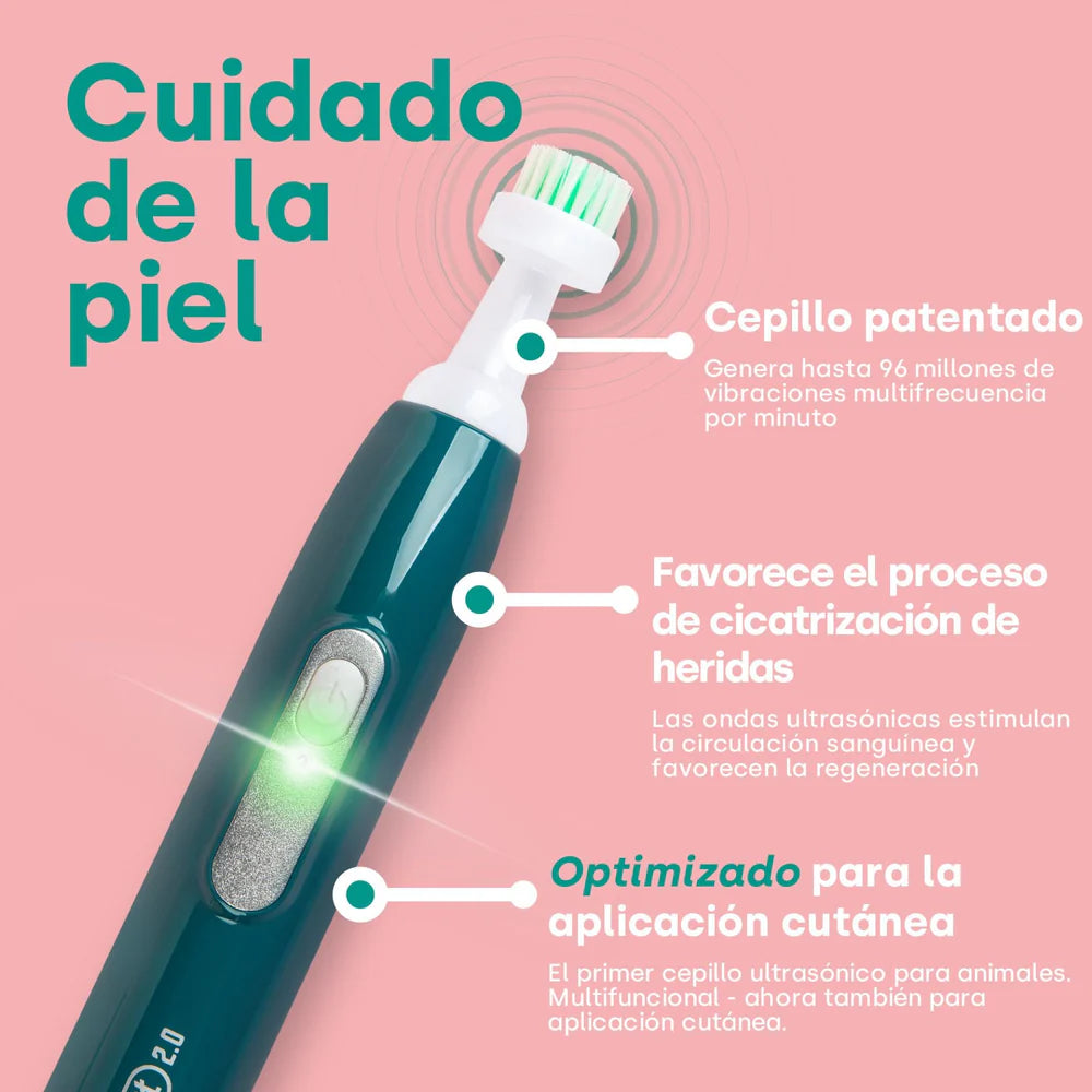 - El ultrasonido se transporta al área a tratar (piel/pelaje o dientes) mediante la frecuencia del tiempo. Al aumentar la frecuencia cardíaca, el ultrasonido se distribuye de manera más uniforme en el área afectada. Esto, a su vez, conduce a un mejor resultado de limpieza y hace que la actualización al set de cuidado de la piel emmi-pet 2.0 sea tan efectiva.