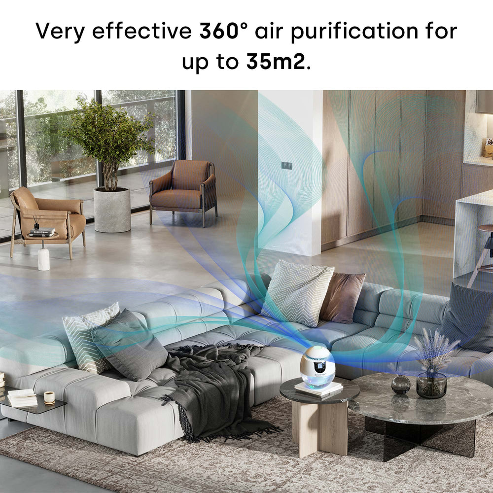 El purificador de aire iónico emmi-Air puede promover esta sensación de frescura. La rotación garantiza la eliminación del polvo y las bacterias y permite eliminar los olores del aire ambiente. Los iones existentes en el aire de la habitación pueden mejorar el bienestar. Se dice que el aire ionizado se absorbe mejor en los pulmones porque las partículas de polvo se vuelven más pesadas debido a la carga negativa y se hunden al suelo. Por ello, el purificador de aire iónico emmi-Air es especialmente adecuado para personas alérgicas.