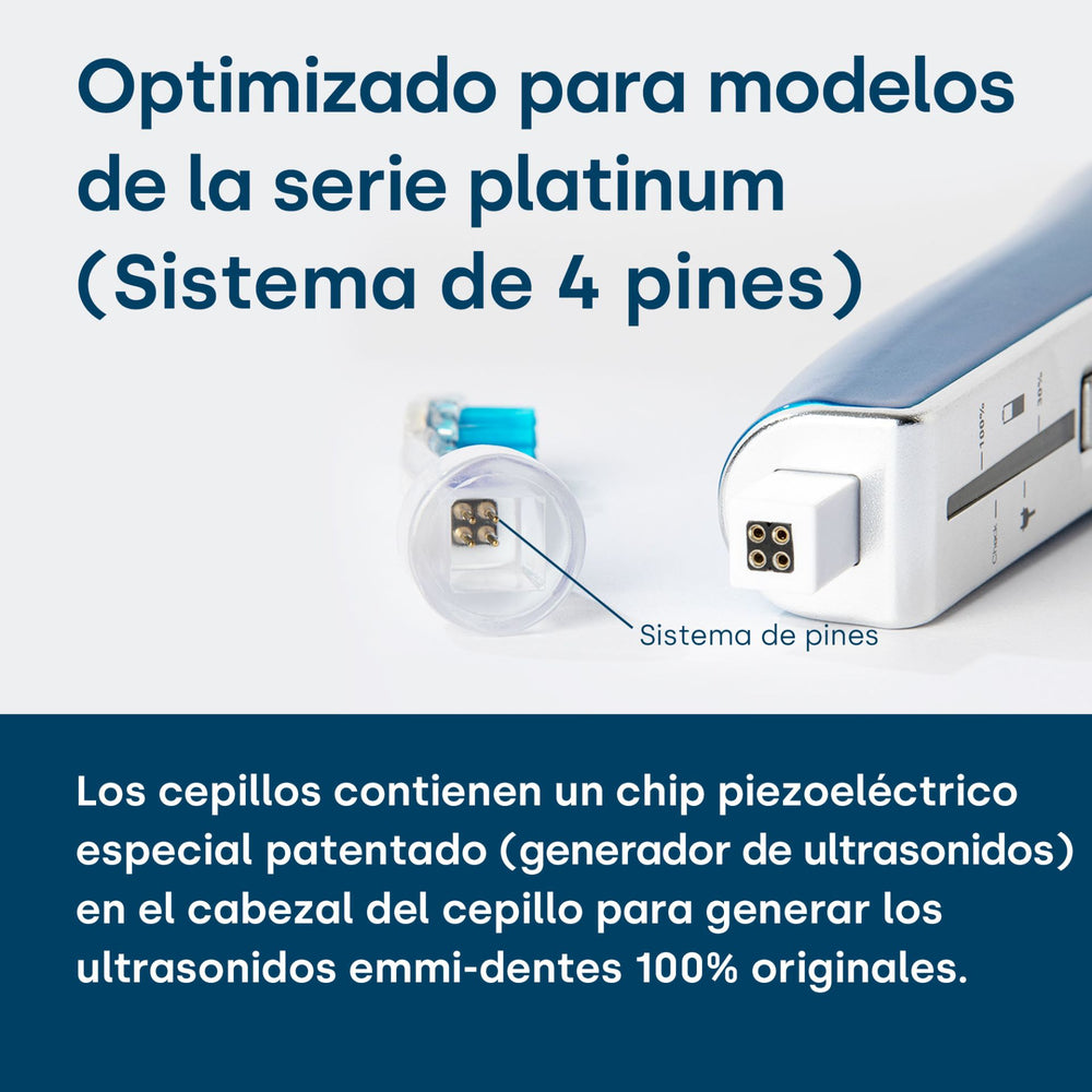 Los cabezales de cepillos ultrasónicos de los cepillos de dientes ultrasónicos emmi-dent contienen un chip piezoeléctrico especial patentado (generador ultrasónico) en el cabezal del cepillo para generar el ultrasonido 100% original de emmi-dent . En la base del cabezal del cepillo ultrasónico emmi-dent Platinum se han integrado cuatro pines de contacto para la conexión a la pieza de mano emmi-dent Platinum. Esta innovación evita que se atasque al enchufarlo y el cabezal del cepillo ultrasónico se puede enchufar y quitar fácilmente. Además, gracias a la sincronización ultrasónica optimizada, son hasta 4 veces más efectivos que el cabezal de cepillo metálico emmi-dent .