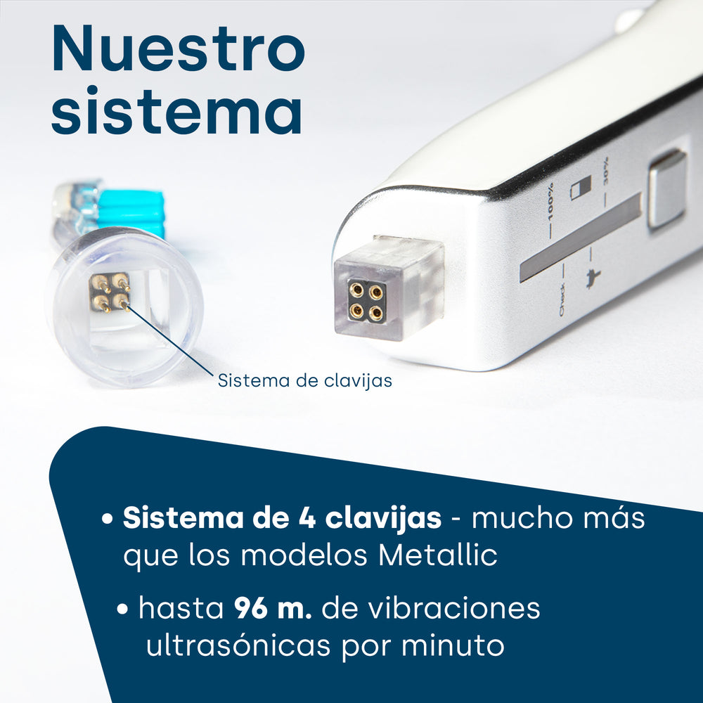 Los cepillos de dientes eléctricos incluyen cepillos de dientes rotatorios, cepillos de dientes sónicos y cepillos de dientes ultrasónicos. Mientras que los primeros suelen tener cepillos redondos que giran alternativamente de izquierda a derecha, los cepillos de dientes sónicos están equipados con cabezales alargados y vibratorios. Con 20.000 a 40.000 vibraciones por minuto consiguen movimientos mecánicos significativamente superiores a los de los cepillos rotativos. Los cepillos de dientes ultrasónicos superan este rendimiento muchas veces y también se basan en una tecnología diferente. Mientras que los cepillos de dientes rotatorios y sónicos eliminan el biofilm con ayuda de movimientos mecánicos, el emmi-dent trabaja con hasta 96 millones de vibraciones ultrasónicas por minuto y no requiere ningún movimiento mecánico para la limpieza de los dientes.