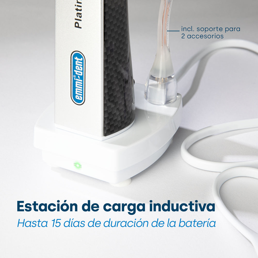 Los cepillos de dientes ultrasónicos son la cumbre de la innovación en el cuidado dental y ofrecen un rendimiento de limpieza que va mucho más allá de lo que es posible con los cepillos de dientes eléctricos tradicionales. Al elegir el mejor cepillo de dientes ultrasónico, debe prestar atención a los factores que afectan tanto la eficiencia de la limpieza como la facilidad de uso. Nuestro cepillo de dientes ultrasónico emmi-dent Platinum está a la vanguardia de esta revolución tecnológica y cumple todos los criterios de un excelente cepillo de dientes ultrasónico: 100% ultrasónico: a diferencia de los cepillos de dientes sónicos, que se basan en movimientos mecánicos, nuestro emmi-dent Platinum funciona con vibraciones ultrasónicas puras: hasta 96 millones de vibraciones por minuto. Esta alta frecuencia permite una limpieza profunda sin contacto mecánico, minimizando el riesgo de lesiones y ofreciendo resultados de limpieza insuperables. La vibración se puede desactivar: emmi-dent Platinum ofrece la opción de desactivar la vibración. Esto garantiza un cuidado personalizado, ya sea para encías sensibles o para una eliminación intensiva de placa, ¡todo ello sin frotar ni vibrar! Batería de larga duración: con una duración de batería de hasta 15 días cuando se usa dos veces al día, nuestro cepillo de dientes ultrasónico establece nuevos estándares en términos de resistencia y elimina la necesidad de una carga frecuente. Acabado de alta calidad: El emmi-dent Platinum se caracteriza por un potente motor y una carcasa resistente al agua, lo que garantiza un uso duradero y fiable. Diversos cabezales de cepillo: Para combinar con nuestro cepillo de dientes ultrasónico, ofrecemos una selección de cabezales de cepillo que están diseñados para diferentes aplicaciones y necesidades del usuario para permitir una limpieza individual y efectiva. El emmi-dent Platinum se distingue de otros cepillos de dientes ultrasónicos por su tecnología avanzada y su orientación al usuario. Entonces, si está buscando el mejor cepillo de dientes ultrasónico, el emmi-dent Platinum le ofrece una combinación de limpieza eficaz, comodidad y tecnología avanzada que garantiza el máximo rendimiento de limpieza e higiene bucal al cepillarse los dientes.