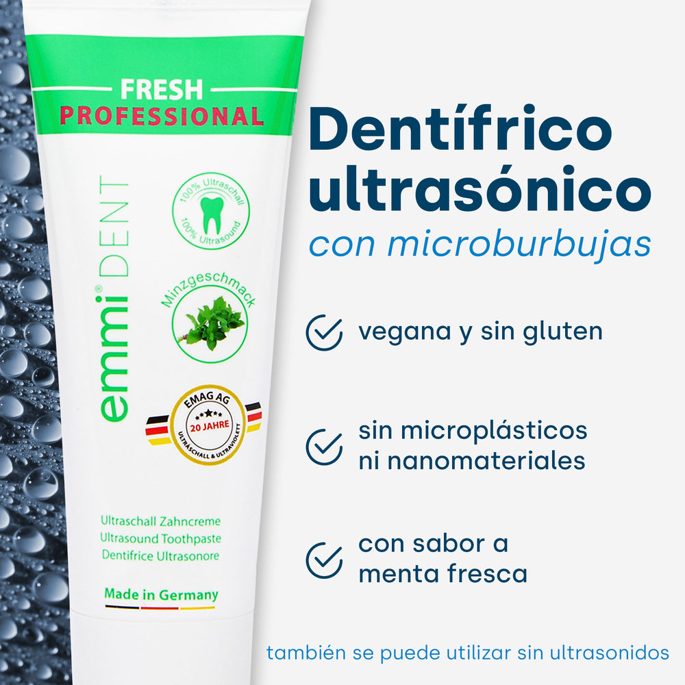 Las ondas ultrasónicas penetran profundamente en los espacios entre los dientes y la línea de las encías, disolviendo eficazmente las bacterias y la placa. Esto ayuda a prevenir la caries, la gingivitis y otras enfermedades dentales. Para obtener resultados aún más completos, se utiliza la pasta de dientes ultrasónica emmi-dent especialmente desarrollada. Las microburbujas contenidas potencian el efecto de la tecnología ultrasónica y garantizan así una limpieza y un cuidado bucal aún más eficaces.