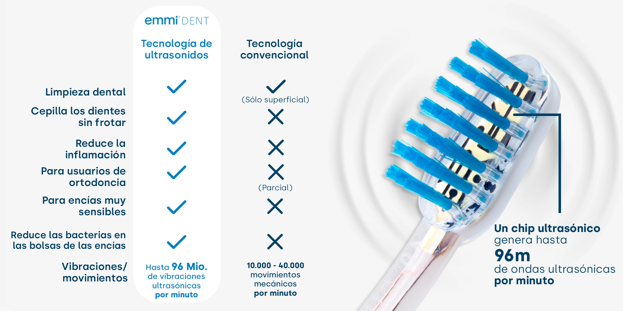 Los cabezales de cepillo ultrasónico de emmi-dent contienen el chip piezoeléctrico patentado, que genera hasta 96 millones de vibraciones por minuto. Estas vibraciones, combinadas con la pasta de dientes ultrasónica especial emmi-dent, se transmiten directamente a los dientes y a la cavidad bucal. Allí, las pequeñas burbujas limpiadoras actúan reduciendo eficazmente las bacterias, la placa y el sarro dental, contribuyendo así a un excelente rendimiento de limpieza.