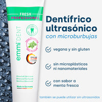 Las ondas ultrasónicas penetran profundamente en los espacios entre los dientes y la línea de las encías. Allí disuelven las bacterias y la placa, lo que previene eficazmente la caries, la gingivitis y otras enfermedades dentales. Para obtener resultados especialmente minuciosos se utiliza la pasta de dientes ultrasónica emmi-dent especialmente desarrollada. Las microburbujas incluidas mejoran enormemente el efecto del ultrasonido.