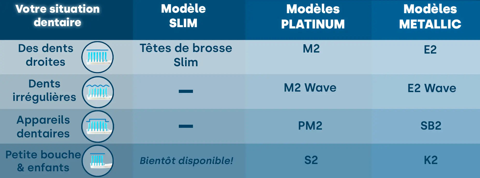 Pour les modèles Platinum, vous avez besoin de nos têtes de brosse à 4 broches, telles que les modèles M2, M2 Wave, S2 et PM2. Les utilisateurs des modèles Metallic , GO ou Professional doivent choisir les têtes de brosse à 2 broches telles que E2, E2 Wave, SB2 ou K2.