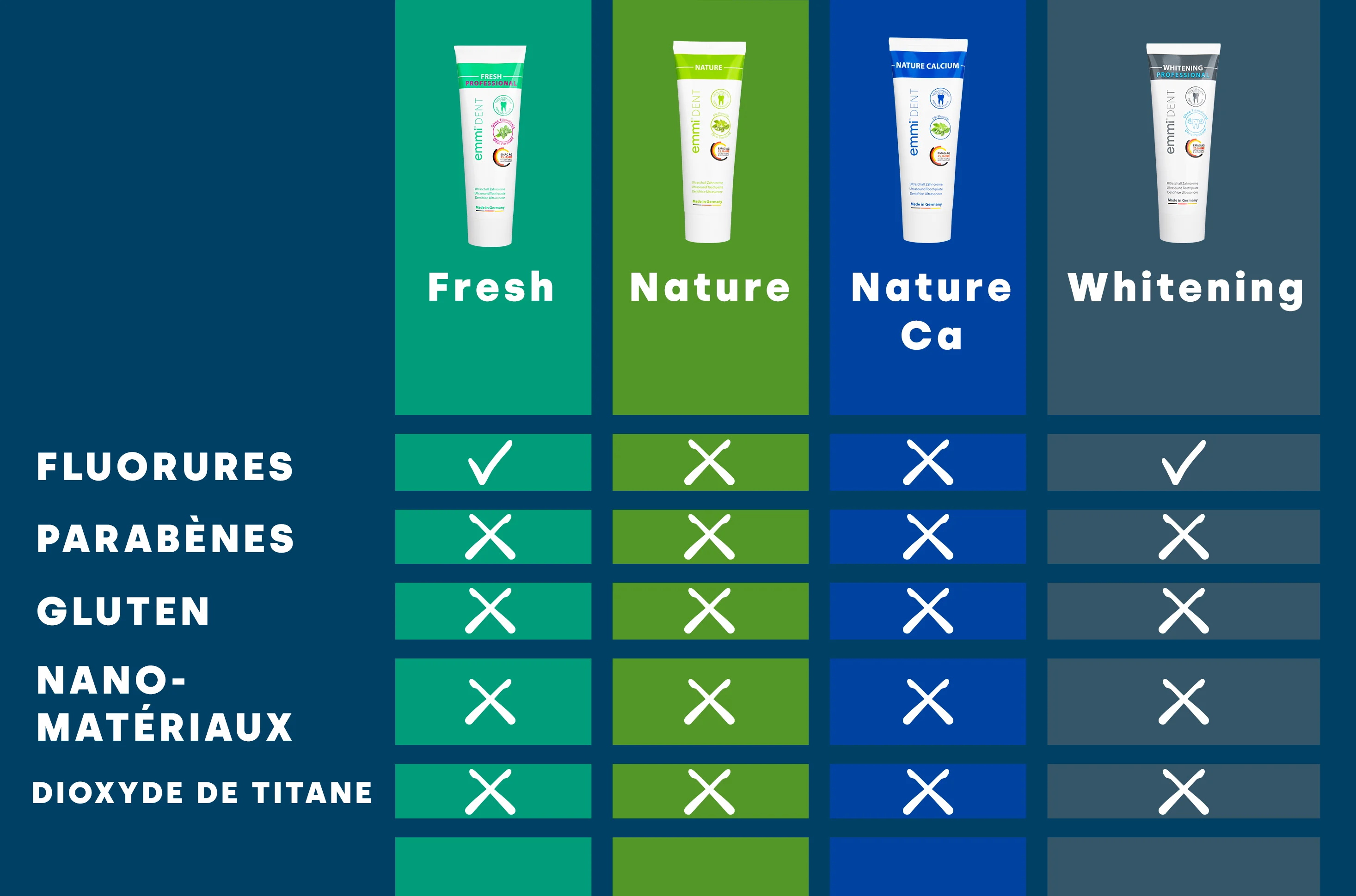 En plus du dentifrice blanchissant, nous proposons également le dentifrice Fresh sans dioxyde de titane. Ce dentifrice est idéal pour le soin quotidien et assure une fraîcheur longue durée en bouche. Il est spécialement formulé pour combattre la plaque dentaire et favoriser la santé bucco-dentaire sans utiliser de dioxyde de titane.