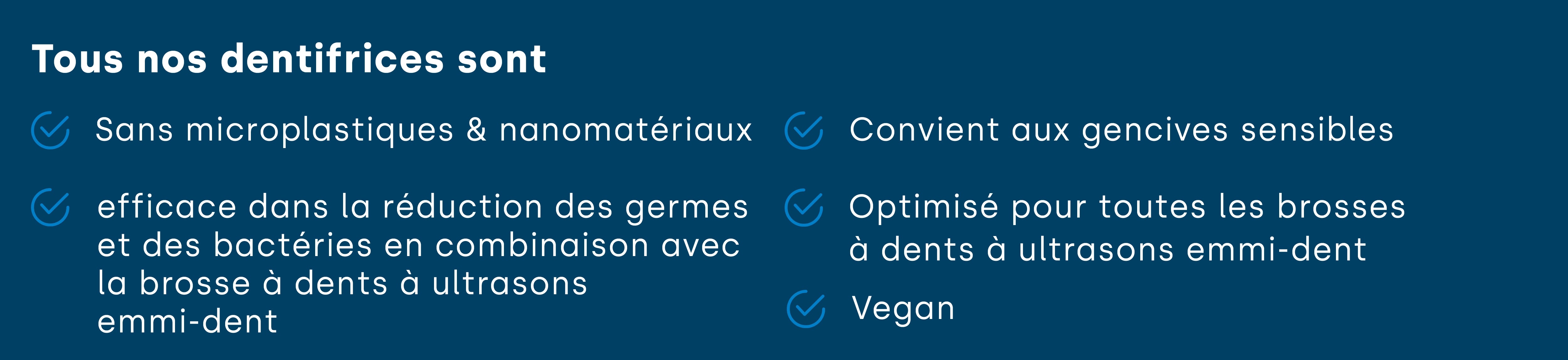 En tant que pionnier des soins dentaires par ultrasons, nous combinons chez emmi-dent une qualité exceptionnelle avec une technologie innovante. Nos dentifrices ont été développés par des experts, testés cliniquement et offrent un résultat de nettoyage incomparable. Faites confiance à l’expertise d’emmi-dent et vivez la différence avec des soins dentaires qui vont au-delà de l’ordinaire. Essayez-le vous-même et trouvez le dentifrice parfait pour un sourire radieux.