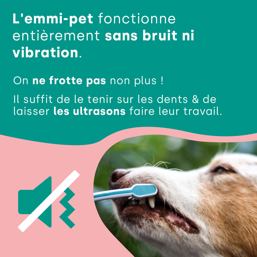 Le kit de base emmi-pet 2.0 convient à tous les propriétaires d'animaux de compagnie qui se soucient personnellement de la santé et des soins de leur compagnon à quatre pattes. Cet ensemble contient tout ce dont vous avez besoin pour éliminer sans douleur, en douceur et en profondeur la plaque dentaire et les bactéries de votre animal.
