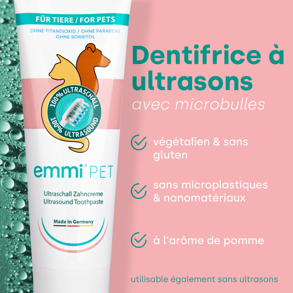 L'offre comprend la brosse à dents à ultrasons emmi-pet de la 2ème génération, ainsi qu'une station de charge, deux têtes de brosse à ultrasons emmi-pet ( 1 x grande / 1 x petite ), le dentifrice à ultrasons emmi-pet pour animaux et un pack de 10 bâtonnets de bois de rose .