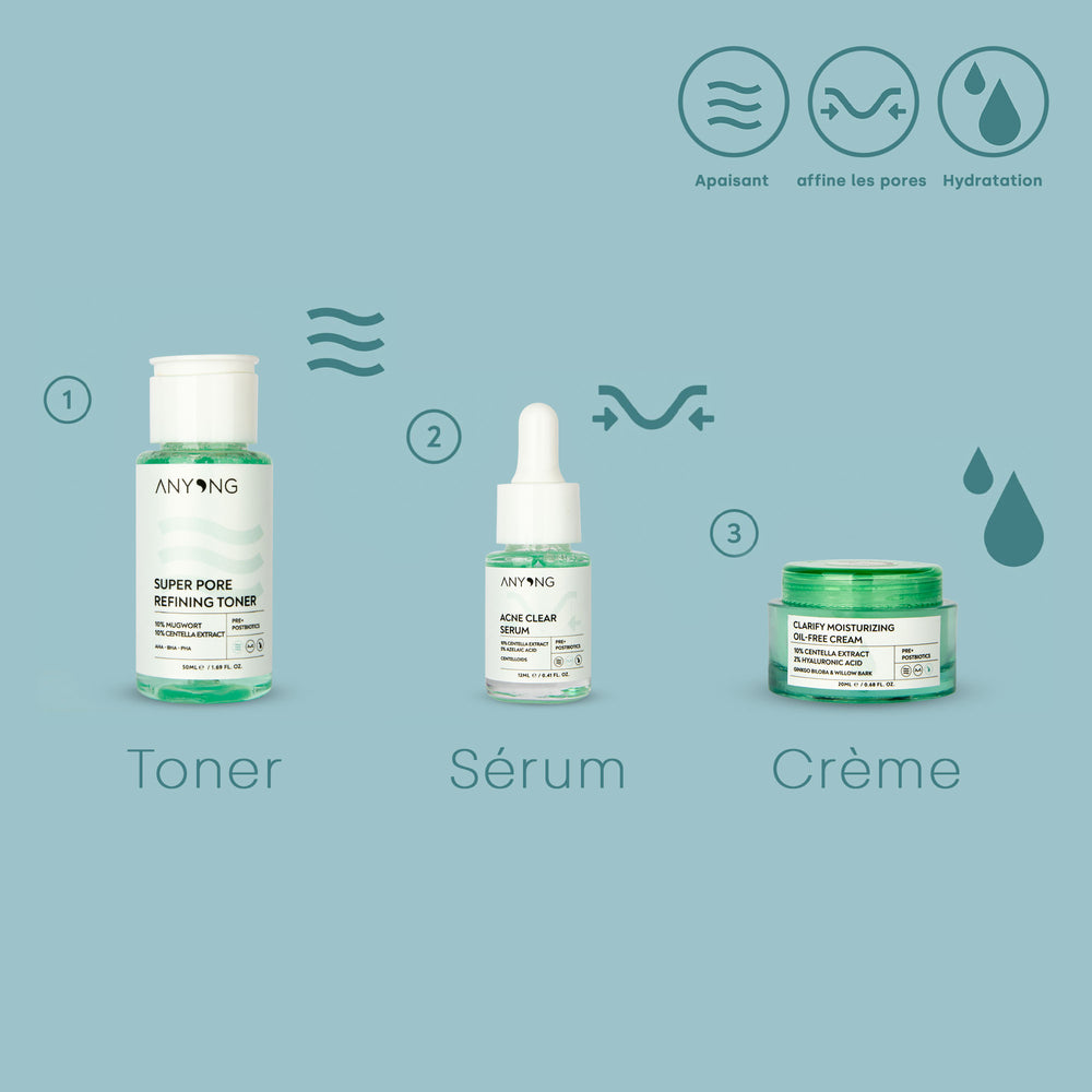 Le kit idéal contre les peaux impures. Le tonique affinant les pores élimine l'excès de sébum, ce qui en fait un préliminaire idéal. Le produit phare pour une peau nette est le sérum Acne Clear, qui contient de l'extrait de cantella et de l'acide azélaïque. Il réagit spécifiquement à vos problèmes de peau et régénère votre peau. L'hydratant sans huile et clarifiant offre une finition douillette.