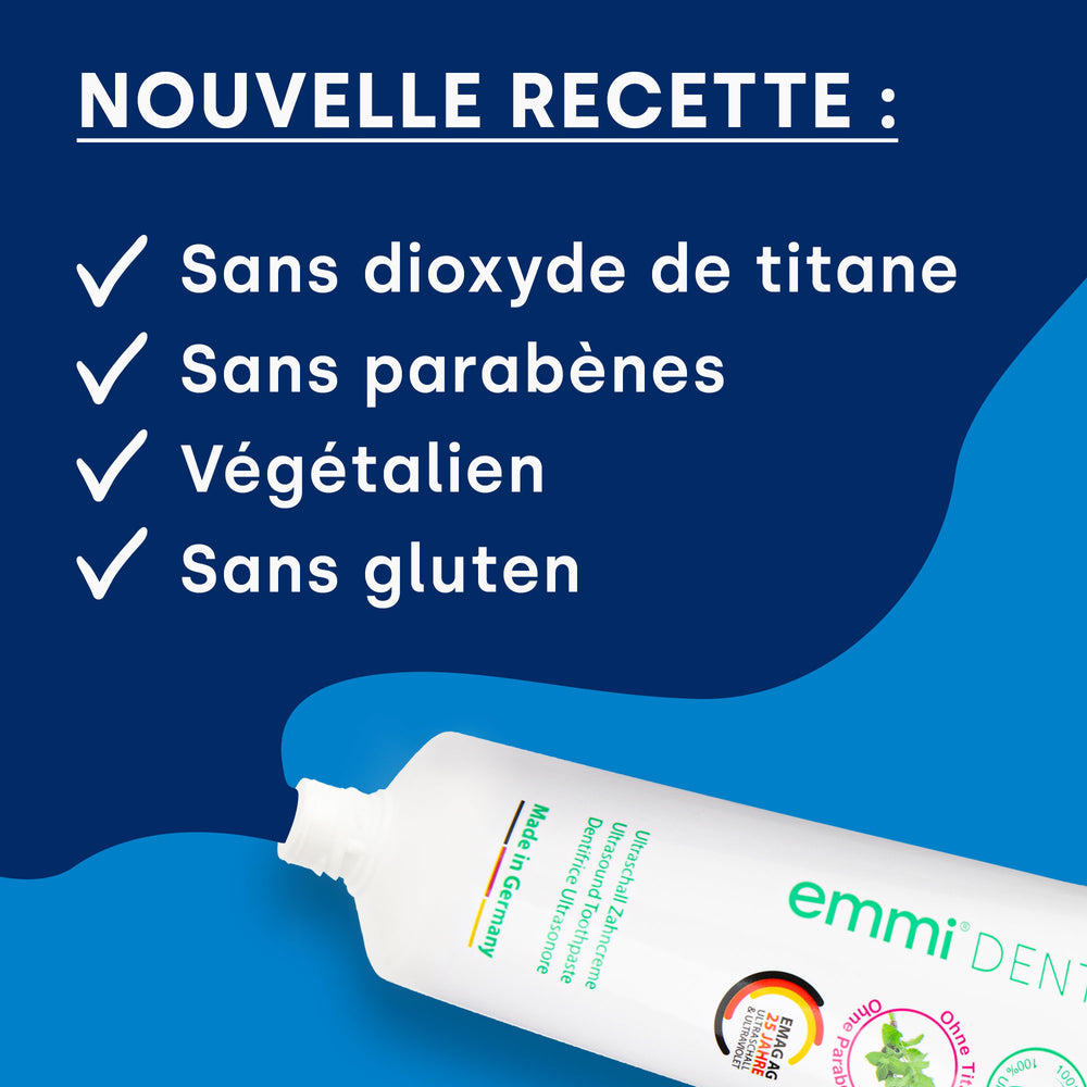 Le dentifrice emmi-dent Fresh est idéal pour les dents sensibles. Il nettoie en douceur, renforce les gencives et combat la plaque dentaire et le tartre. Avec des ingrédients naturels, il procure une haleine fraîche et une sensation de propreté grâce à la technologie révolutionnaire des ultrasons.
