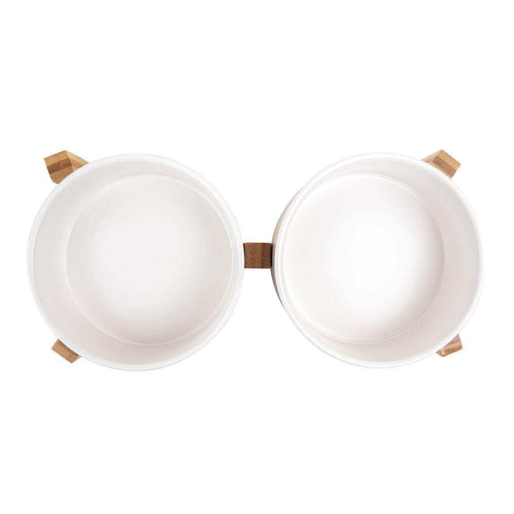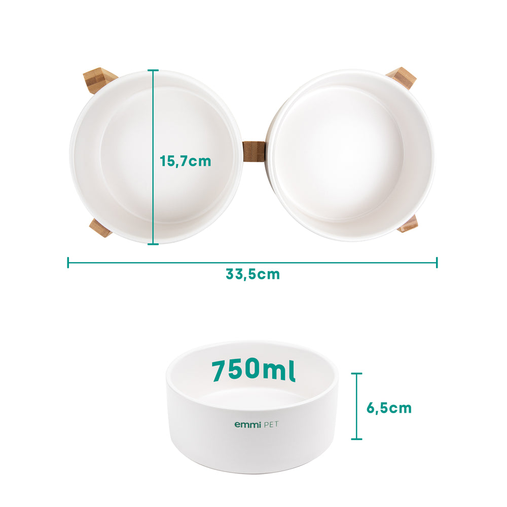 Le bol d'eau et de nourriture emmi-pet en un est fabriqué en céramique de haute qualité et offre une solution pratique et peu encombrante pour nourrir votre chien. Pour résister à une utilisation quotidienne, il est très robuste et assure une longue durée de vie. Le poids agréable des deux bols et le cadre en bois assorti assurent la stabilité et garantissent le plaisir de la ration alimentaire quotidienne. La surface lisse des gamelles pour chien facilite l'entretien et l'hygiène quotidiens. Ils peuvent être lavés à la main ou nettoyés au lave-vaisselle. Grâce à la base antidérapante, les bols en céramique restent stables sur le sol et évitent ainsi qu'ils ne se renversent. Cela minimise les déversements et garantit un environnement propre. Le cadre en bois est recouvert de vernis pour le protéger de l'eau. La barre d'alimentation pour petits et grands chiens est un accroche-regard pour chaque propriétaire d'animal grâce à son look moderne.
