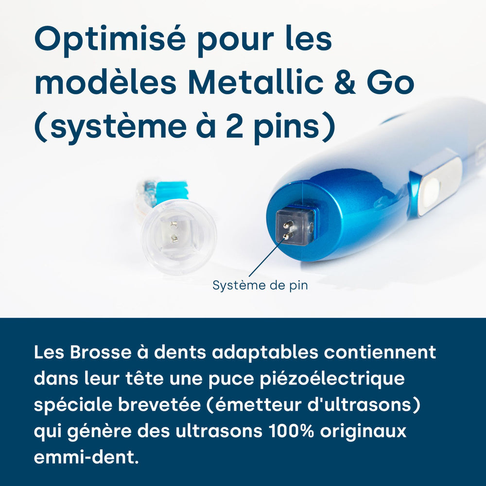 Les têtes de brosse à ultrasons des brosses à dents à ultrasons emmi-dent contiennent une puce piézo spéciale brevetée (générateur d'ultrasons) dans la tête de brosse pour générer les ultrasons emmi-dent 100 % originaux. Deux broches de contact renforcées ont été intégrées dans les bases des têtes de brosse à ultrasons emmi-dent Metallic et Go pour la connexion à la pièce à main emmi-dent Metallic et Go. Cette innovation évite le blocage lors du branchement et la tête de brosse à ultrasons peut être facilement branchée et retirée.