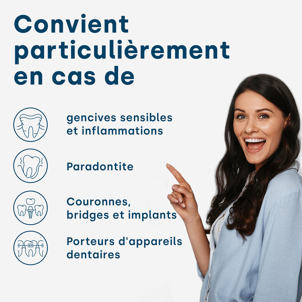Parce qu’il nettoie en douceur sans frotter, il est parfait pour les personnes ayant des dents et des gencives sensibles. Grâce à son nettoyage doux, sans frottement, il est parfait pour les personnes ayant des dents et des gencives sensibles...