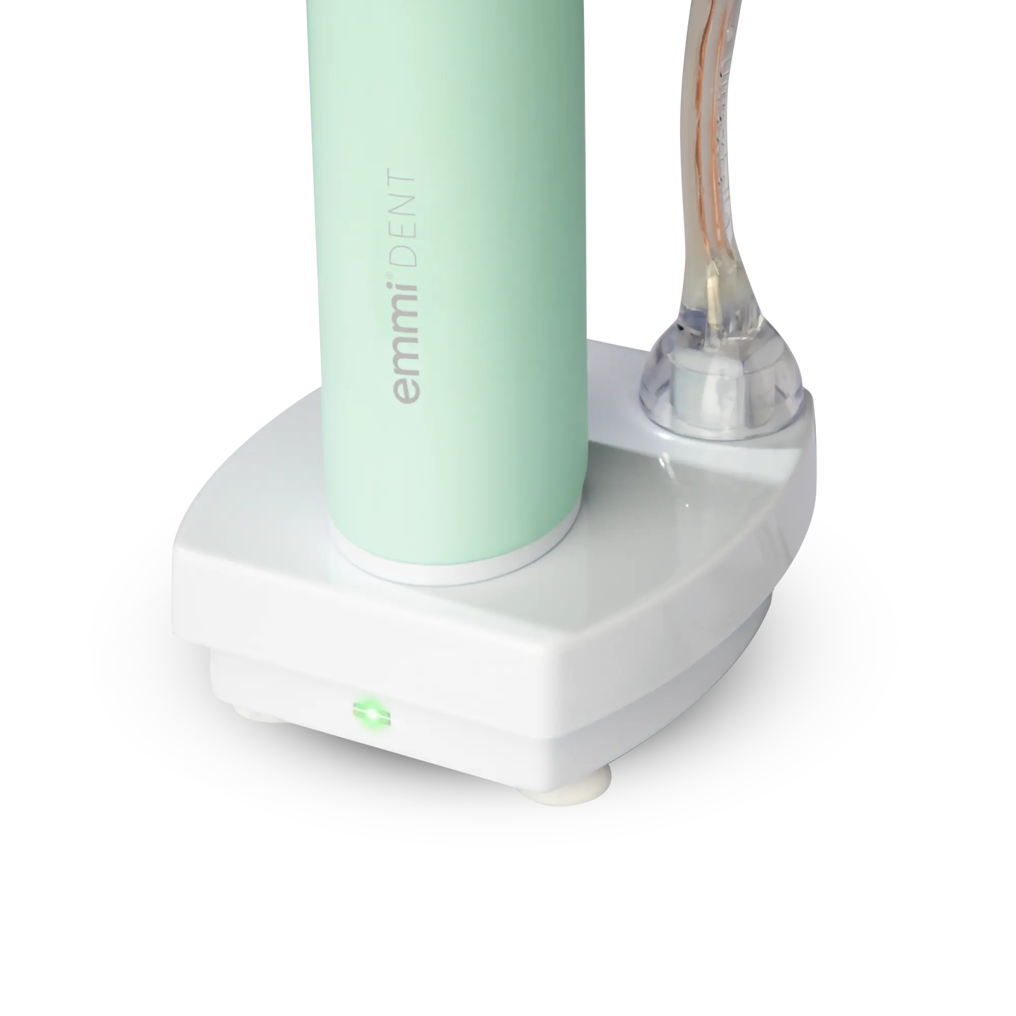 Une particularité de l'emmi-dent Metallic est la possibilité de désactiver la vibration à volonté. Pour ce faire, maintenez simplement le bouton d’alimentation enfoncé pendant environ 10 secondes jusqu’à ce que la LED clignote 3 fois. Retirez maintenant votre doigt de l’interrupteur et allumez-le normalement. Voulez-vous l'annuler ? Suivez simplement le même processus. La possibilité de désactiver les vibrations signifie que les personnes qui préfèrent un nettoyage sans vibrations peuvent également bénéficier de la technologie à ultrasons.