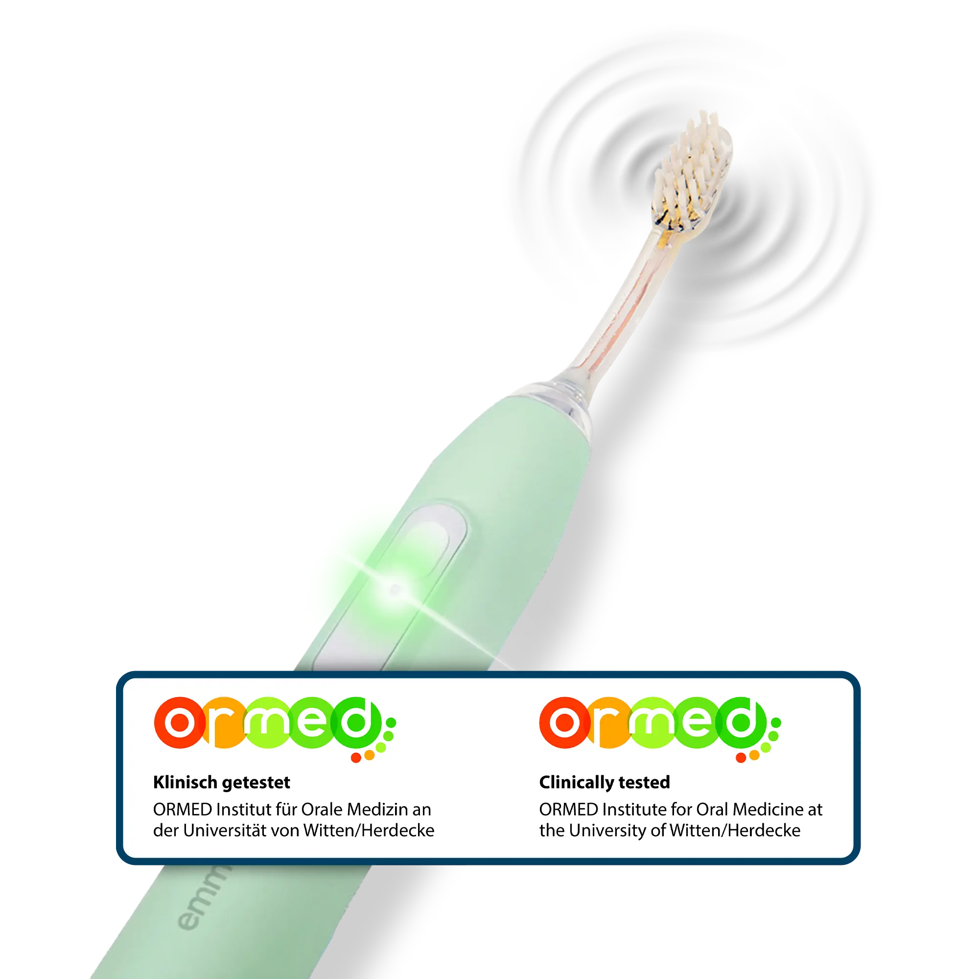 L'emmi-dent Metallic est conçu pour être convivial et sans danger pour les enfants. La technologie douce des ultrasons garantit une expérience de nettoyage efficace et non invasive. La brosse à dents est conçue pour le confort et la sensibilité des bouches sensibles et convient donc aux personnes de différents âges.