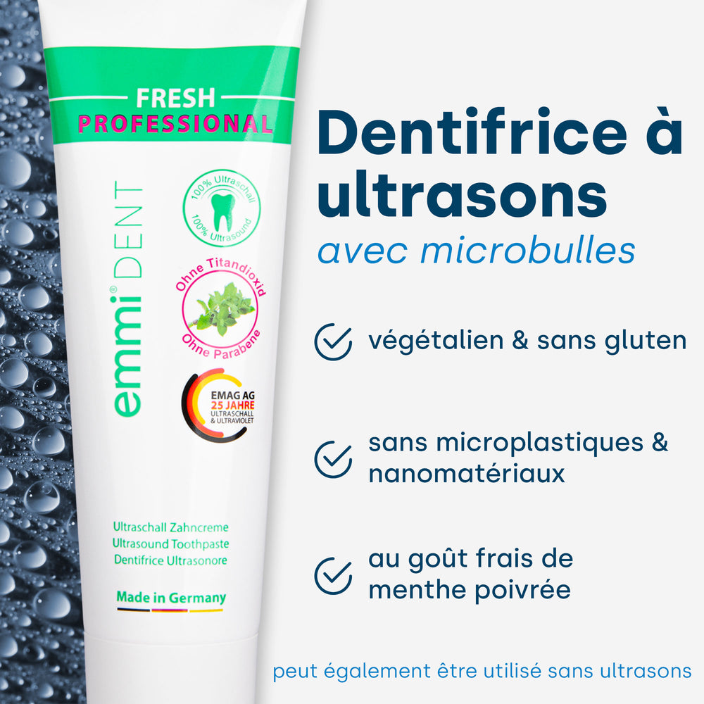 L'emmi-dent Metallic utilise un dentifrice ultrasonique spécial qui contient les microbulles nécessaires, qui sont environ 1000 fois plus petites que les bulles de dentifrice classiques. Ces microbulles sont ajoutées lors d’une étape supplémentaire du processus de production pour garantir une expérience de nettoyage optimale – retrouvez l’étude sur leur existence ici. Considérez les cinq différentes options de dentifrice disponibles pour emmi-dent et leurs avantages et caractéristiques respectifs.