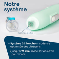 Les ultrasons réduisent les bactéries, même dans les poches des gencives, réduisent la mauvaise haleine et atteignent également les endroits difficiles d'accès : espaces interdentaires, réduction des bactéries, pour les porteurs d'appareils orthodontiques, d'implants, etc....