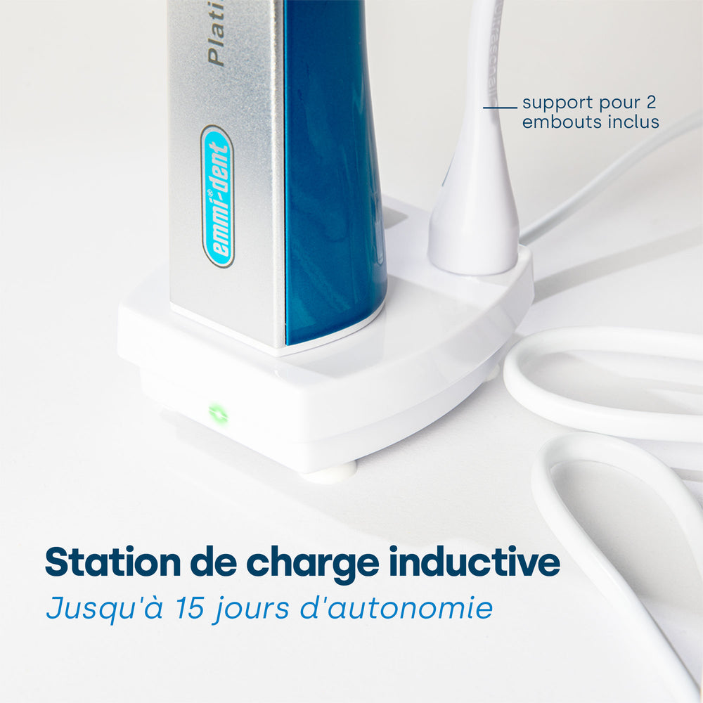 L'emmi-dent Platinum Care a une durée de vie de la batterie plus longue que ses modèles prédécesseurs. Avec une utilisation régulière 2 à 3 fois par jour, le Platinum Care peut durer jusqu'à 15 jours avant de devoir être rechargé. Cette durée de vie prolongée de la batterie (lithium-ion) offre commodité et utilisation ininterrompue et élimine le besoin de charges fréquentes.