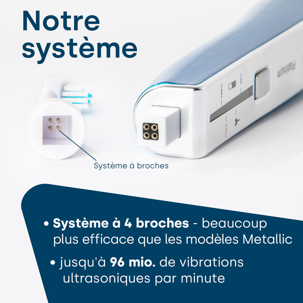 Le modèle Platinum Care utilise une synchronisation optimisée grâce à l'intégration d'un système à 4 broches. Cette amélioration rend la technologie à ultrasons beaucoup plus efficace par rapport aux modèles emmi-dent Metallic et Go. Le timing amélioré permet une action de nettoyage plus efficace et plus puissante, garantissant une élimination complète de la plaque dentaire et une hygiène bucco-dentaire.
