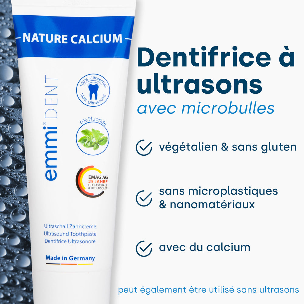 L'emmi-dent Platinum utilise un dentifrice ultrasonique spécial qui contient les microbulles nécessaires, qui sont environ 1000 fois plus petites que les bulles de dentifrice classiques. Ces microbulles sont ajoutées lors d’une étape supplémentaire du processus de production pour garantir une expérience de nettoyage optimale – retrouvez l’étude sur leur existence ici. Considérez les cinq différentes options de dentifrice disponibles pour emmi-dent et leurs avantages et caractéristiques respectifs.