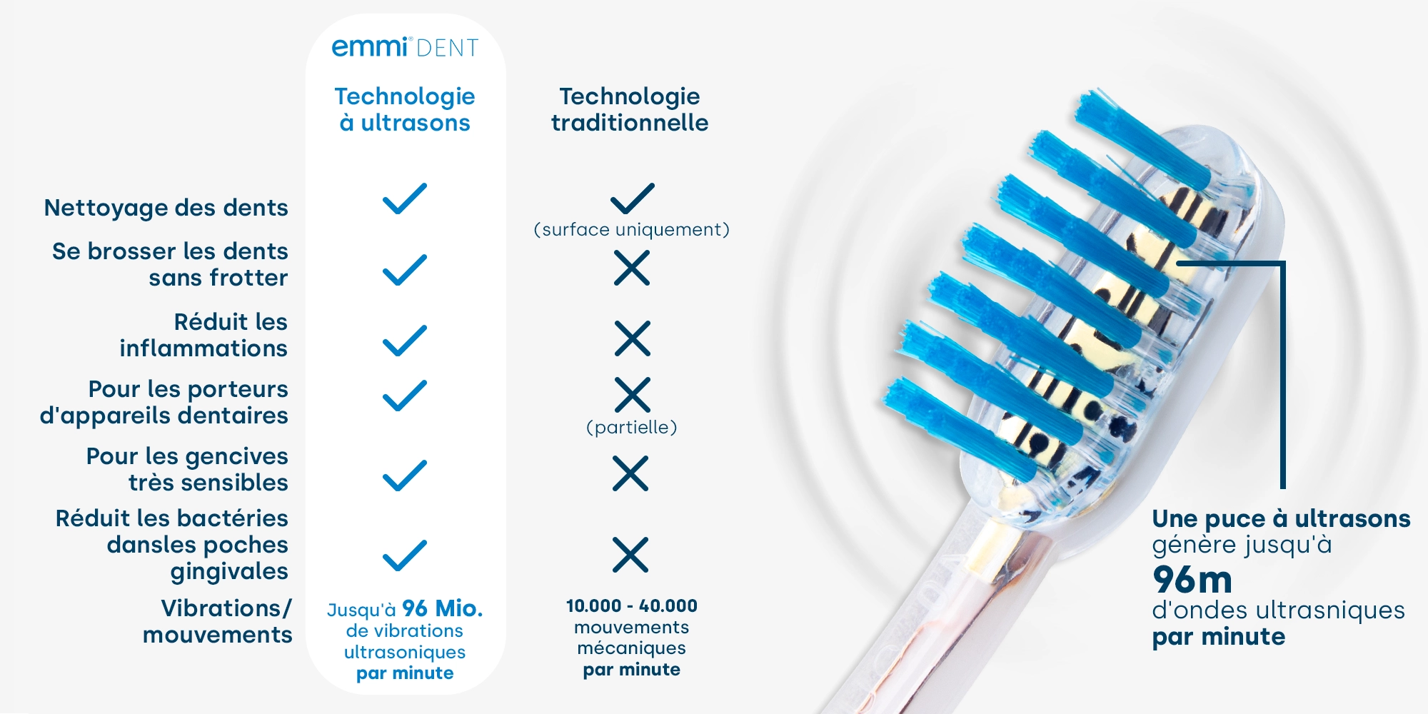 Les soins dentaires avec des brosses à dents conventionnelles se limitent aux zones de la bouche atteintes par la brosse à dents rotative ou sonique. Contrairement aux brosses à dents électriques classiques, la brosse à dents à ultrasons fonctionne totalement sans pression en transmettant des vibrations. Cela signifie que toute la cavité buccale est soigneusement nettoyée.