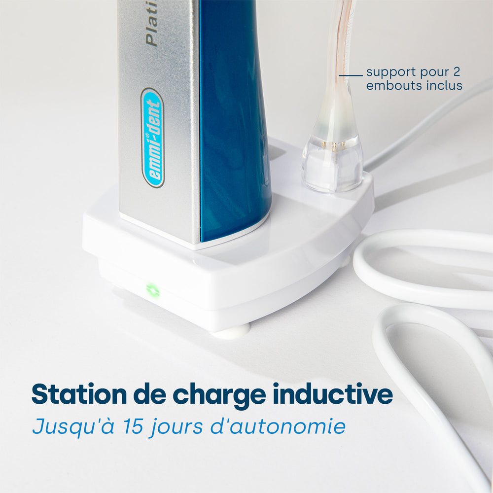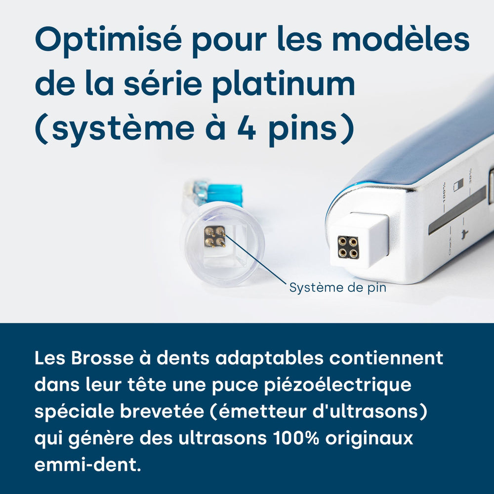 Les brosses à dents à ultrasons sont le summum de l’innovation en matière de soins dentaires, offrant des performances de nettoyage qui vont bien au-delà de ce qui est possible avec les brosses à dents électriques traditionnelles. Lorsque vous choisissez la meilleure brosse à dents à ultrasons, vous devez prêter attention aux facteurs qui affectent à la fois l’efficacité du nettoyage et la facilité d’utilisation. Notre brosse à dents à ultrasons emmi-dent Platinum est à la pointe de cette révolution technologique et répond à tous les critères d'une excellente brosse à dents à ultrasons : 100% ultrasonique : Contrairement aux brosses à dents soniques, qui sont basées sur des mouvements mécaniques, notre emmi-dent Platinum fonctionne avec des vibrations ultrasoniques pures - jusqu'à 96 millions de vibrations par minute. Cette haute fréquence permet un nettoyage en profondeur sans contact mécanique, minimisant ainsi le risque de blessure et offrant des résultats de nettoyage inégalés. Vibration désactivable : L'emmi-dent Platinum offre la possibilité de désactiver la vibration. Cela garantit un soin sur mesure, que ce soit pour les gencives sensibles ou pour une élimination intensive de la plaque dentaire – le tout sans frottement ni vibration ! Longue durée de vie de la batterie : avec une autonomie allant jusqu'à 15 jours lorsqu'elle est utilisée deux fois par jour, notre brosse à dents à ultrasons établit de nouvelles normes en termes d'endurance et élimine le besoin de charge fréquente. Fabrication de haute qualité : l'emmi-dent Platinum se caractérise par un moteur puissant et un boîtier étanche, qui garantit une utilisation durable et fiable. Têtes de brosse diverses : Pour correspondre à notre brosse à dents à ultrasons, nous proposons une sélection de têtes de brosse conçues pour différentes applications et besoins des utilisateurs afin de permettre un nettoyage individuel et efficace. L'emmi-dent Platinum se distingue des autres brosses à dents à ultrasons par sa technologie avancée et son orientation utilisateur. Alors si vous recherchez la meilleure brosse à dents à ultrasons, l'emmi-dent Platinum vous offre une combinaison de nettoyage efficace, de confort et de technologie avancée qui garantit des performances de nettoyage et une hygiène bucco-dentaire maximales lors du brossage des dents !