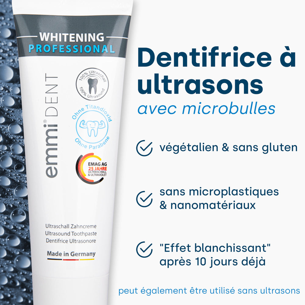 Les ondes ultrasoniques pénètrent profondément dans les espaces entre les dents et la ligne des gencives, dissolvant efficacement les bactéries et la plaque. Cela aide à prévenir la carie dentaire, la gingivite et d’autres maladies dentaires. Pour des résultats encore plus approfondis, le dentifrice à ultrasons emmi-dent spécialement développé est utilisé. Les microbulles contenues renforcent l'effet de la technologie à ultrasons et assurent ainsi un nettoyage et un soin bucco-dentaire encore plus efficaces.