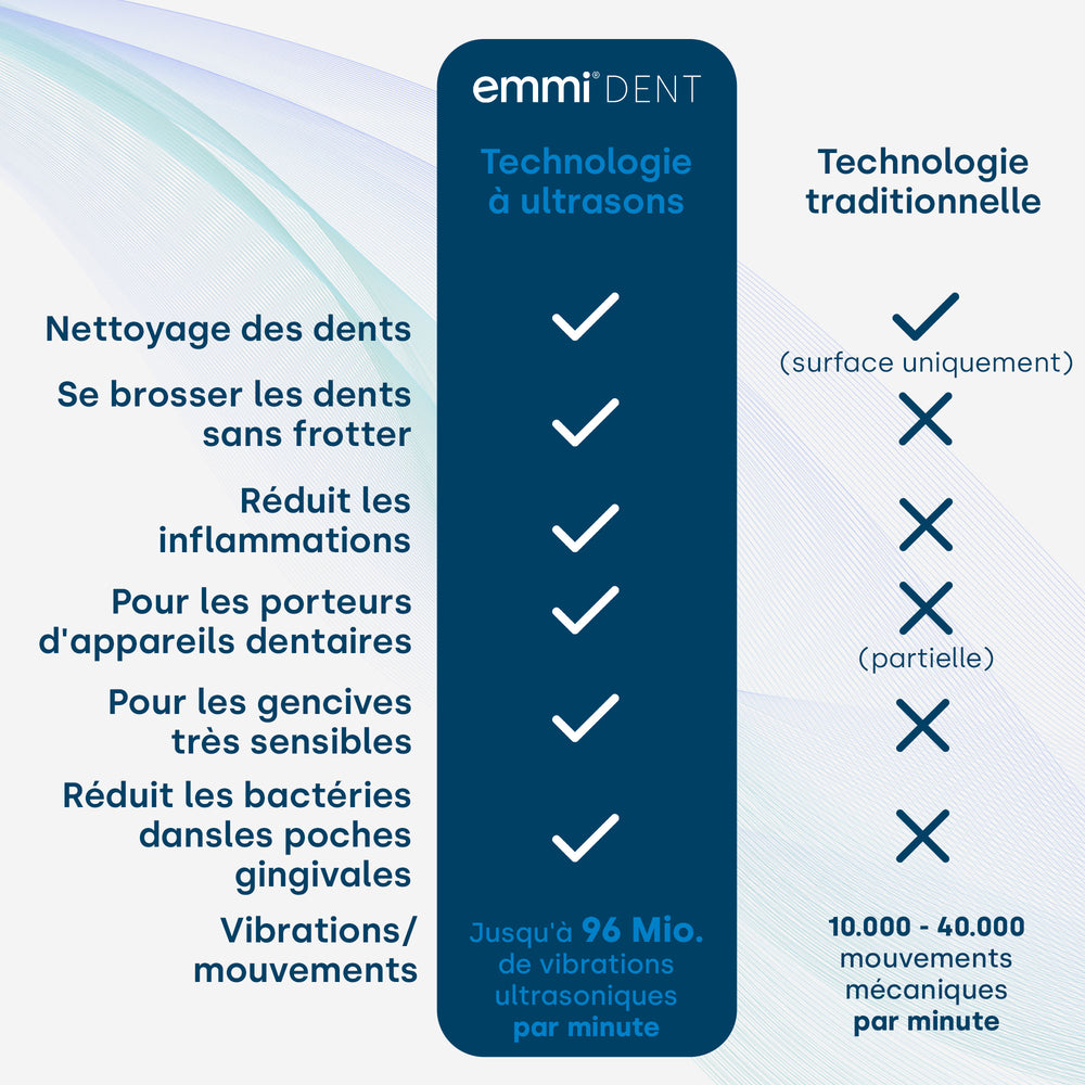 également une technologie complètement différente. Alors que les brosses à dents rotatives et soniques éliminent le biofilm à l'aide de mouvements mécaniques, l'emmi-dent fonctionne avec jusqu'à 96 millions de vibrations ultrasoniques par minute et ne nécessite aucun mouvement mécanique pour le nettoyage des dents. Nettoyage des dents sans mouvement grâce à la dernière technologie à ultrasons.