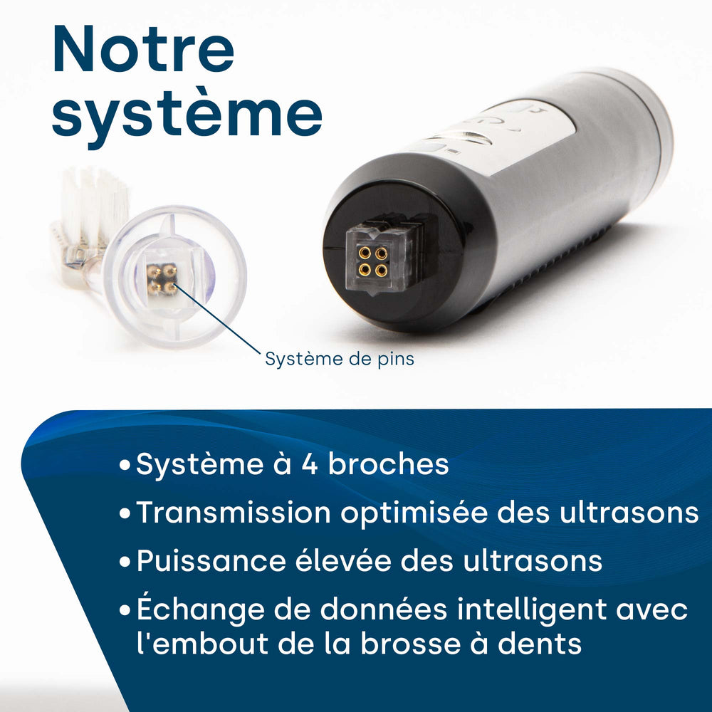 Les brosses à dents fonctionnant aux ultrasons révolutionnent le brossage des dents depuis 2013. L'avantage décisif par rapport aux brosses à dents manuelles classiques ou aux brosses à dents électriques est que les brosses à dents à ultrasons fonctionnent presque sans contact et sans mouvements mécaniques. Cela rend le nettoyage particulièrement doux et pourtant fiable et approfondi.