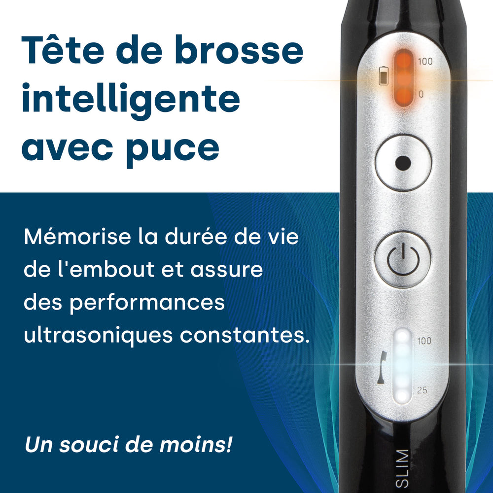 Les têtes de brosse emmi-dent Slim sont non seulement brevetées, mais également intelligentes. La puce piézo intégrée génère jusqu'à 96 millions de vibrations par minute et les transmet directement aux dents et aux gencives. En combinaison avec le dentifrice spécial à ultrasons emmi-dent, de minuscules bulles de nettoyage sont créées qui éliminent particulièrement efficacement la plaque dentaire, les bactéries et les dépôts - pour un nettoyage en profondeur et en douceur jusqu'aux interstices les plus profonds.