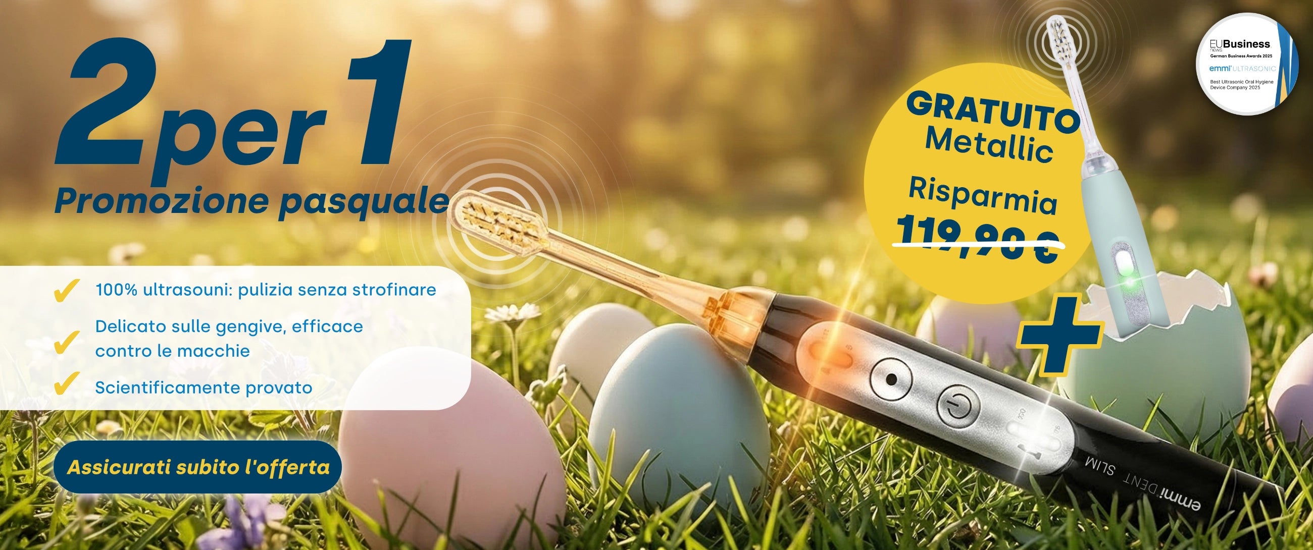 Gli spazzolini elettrici includono spazzolini rotanti, sonici e ultrasonici. Mentre gli spazzolini rotanti hanno in genere testine rotonde che ruotano alternativamente da sinistra a destra, gli spazzolini sonici sono dotati di testine vibranti allungate. Con 20.000-40.000 vibrazioni al minuto, raggiungono movimenti meccanici significativamente più elevati rispetto agli spazzolini rotanti. Gli spazzolini a ultrasuoni superano di gran lunga queste prestazioni e rappresentano una tecnologia completamente diversa. Mentre gli spazzolini rotanti e sonici rimuovono il biofilm utilizzando movimenti meccanici, emmi-dent funziona con un massimo di 96 milioni di vibrazioni ultrasoniche al minuto e non richiede movimenti meccanici per la pulizia. Pulizia dei denti senza movimento grazie alla tecnologia ultrasonica brevettata all'avanguardia.