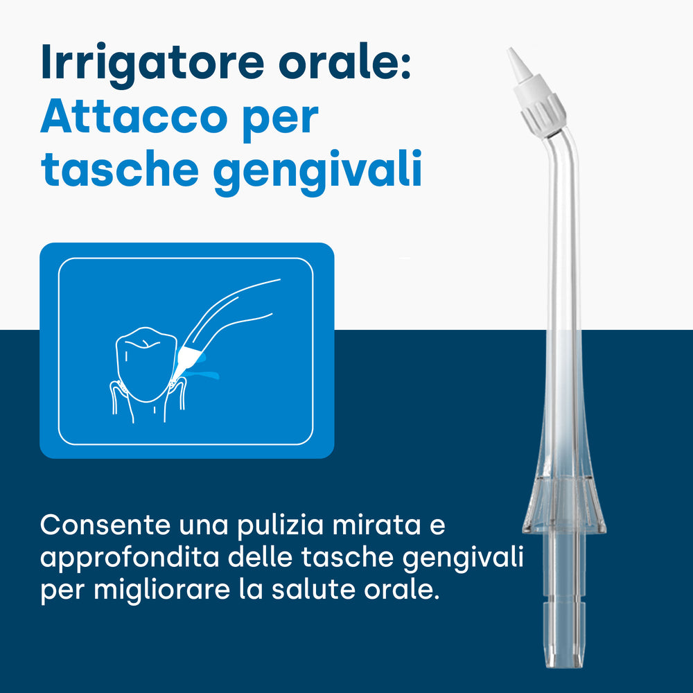 Adatto per la pulizia delle tasche parodontali, iniettato in aree specifiche sotto lo spazio gengivale. La colonna d'acqua pulsata penetra in profondità nella tasca parodontale/area sottogengivale. L'ugello morbido e sottile può rimuovere i batteri nocivi nella tasca parodontale/6-7 mm sotto la gengiva. Il flusso d'acqua pulsante massaggia piacevolmente le gengive.
