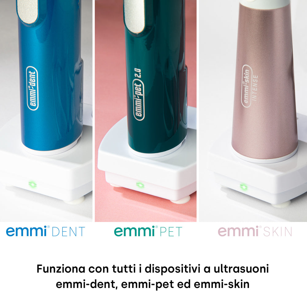 Con la stazione di ricarica emmi 100-240 Ultra puoi creare un secondo "pilastro" per ricaricare i tuoi dispositivi, soprattutto se più persone utilizzano la stazione. Utilizza i dispositivi ad ultrasuoni emmi-dent per la pulizia dei denti e l'igiene orale con ultrasuoni originali al 100%.
