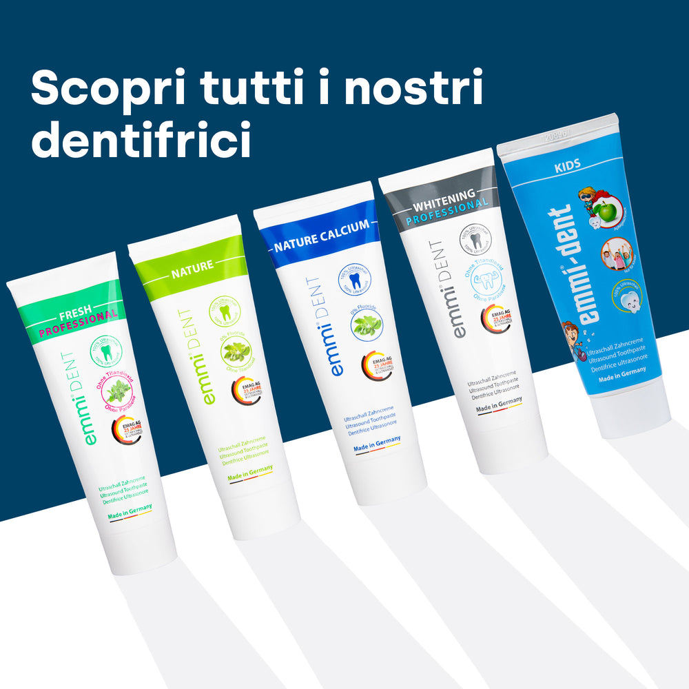 Il dentifricio emmi-dent Nature Calcium Ultrasonic contiene calcio di alta qualità che rinforza i denti e ne rimineralizza lo smalto. Rafforzando lo smalto, i denti diventano più resistenti agli attacchi degli acidi e alla carie. Affidati a emmi-dent e dona ai tuoi denti il rinforzo naturale che meritano.