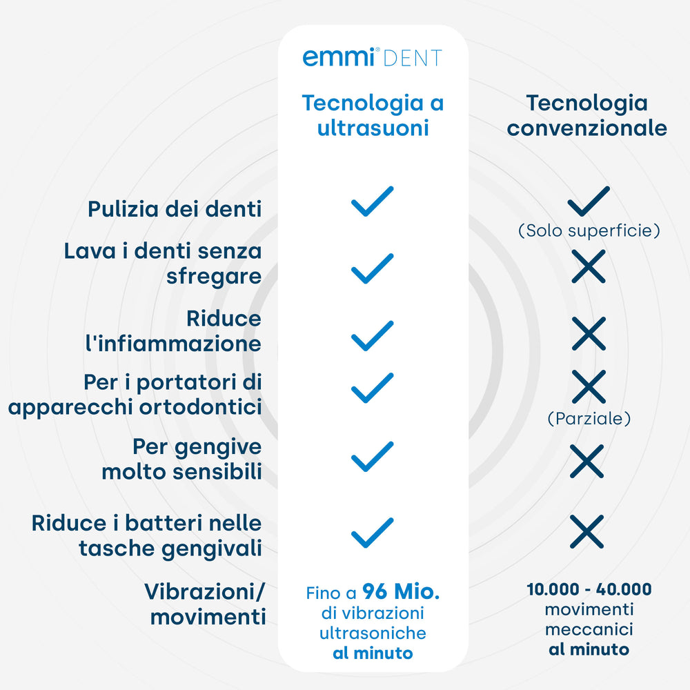 La tecnologia ad ultrasuoni ha dimostrato di essere efficace nella pulizia professionale dei denti presso il dentista. Si utilizza un ultrasuono “duro”, ovvero a bassa frequenza e ad alta potenza. Da molti anni i dentisti utilizzano con successo questo metodo per rimuovere il tartaro e altri contaminanti. Lo spazzolino ultrasonico consente anche l'uso quotidiano della tecnologia a ultrasuoni a casa. L’innovativo emmi-dent utilizza un ultrasuono “soft” ad alta frequenza e bassa potenza.