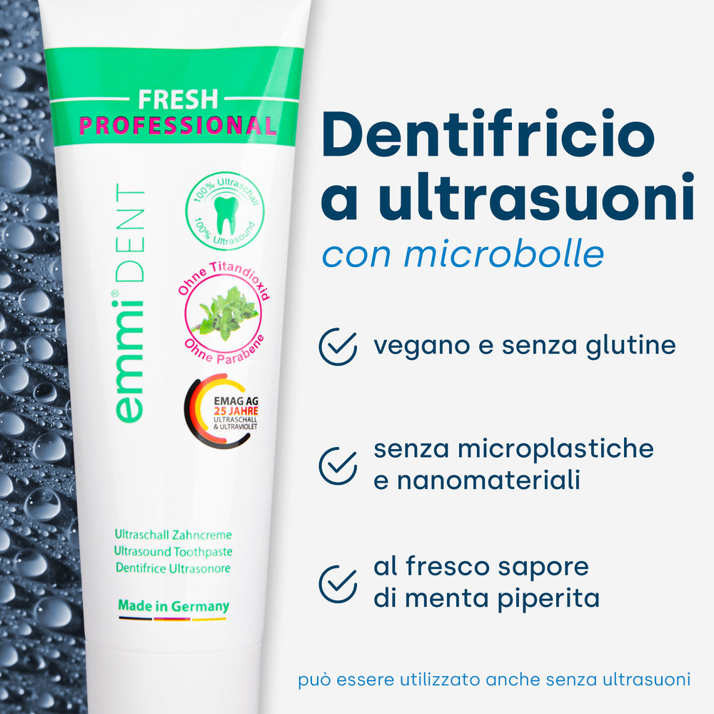 Emmi-dent Metallic utilizza uno speciale dentifricio a ultrasuoni che contiene le microbolle necessarie, circa 1000 volte più piccole delle normali bolle del dentifricio. Queste microbolle vengono aggiunte in un ulteriore passaggio del processo di produzione per garantire un'esperienza di pulizia ottimale: scopri qui lo studio sulla loro esistenza. Prendiamo in considerazione le cinque diverse opzioni di dentifricio disponibili per emmi-dent e i rispettivi vantaggi e caratteristiche.