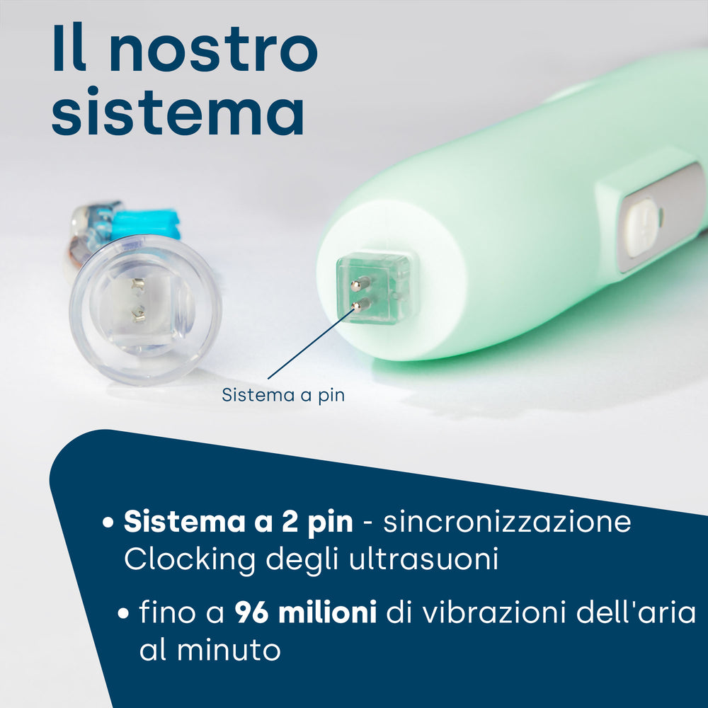 Il modello Metallic è il modello standard della gamma e offre una temporizzazione degli ultrasuoni ottimizzata, adatta sia ai bambini che agli adulti. Con un sistema a 2 pin e una durata della batteria di 12 giorni, coniuga efficienza e facilità d'uso.