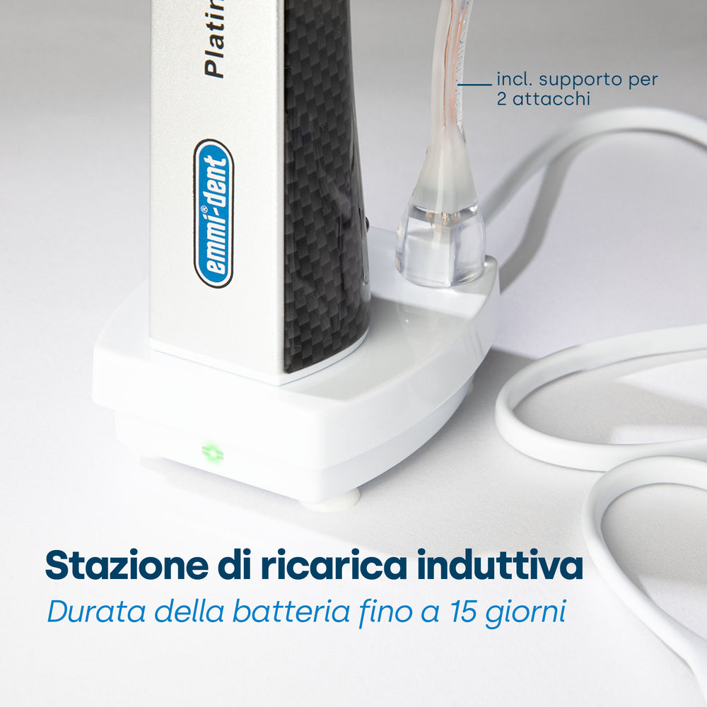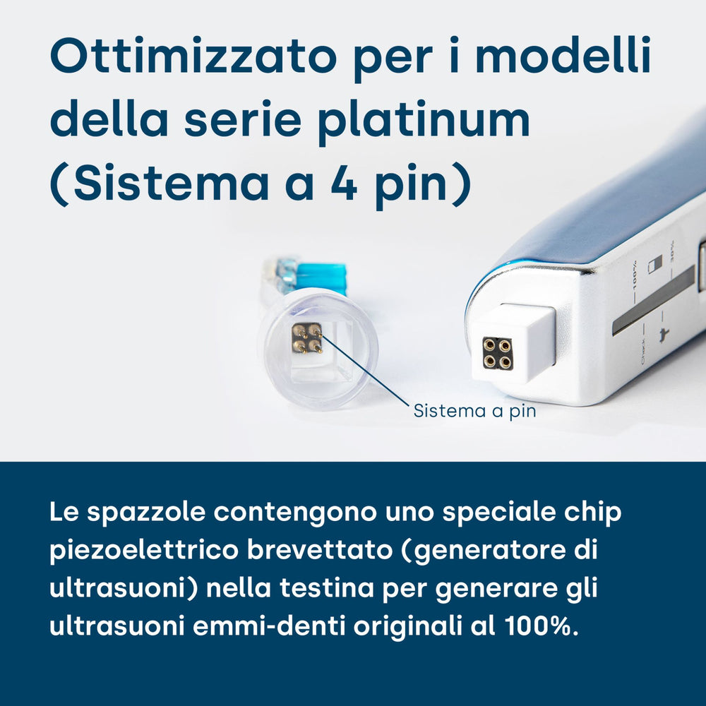 La tecnologia ad ultrasuoni sta rivoluzionando il modo di pulire e prendersi cura dei denti. emmi-dent Platinum è la prima generazione di spazzolini ultrasonici emmi-dent con sistema a 4 pin. Ciò significa che emmi-dent Platinum genera fino a 4 impulsi ultrasonici al secondo.