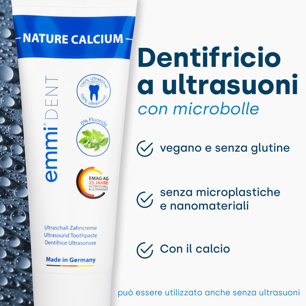 Le onde ultrasoniche penetrano in profondità negli spazi tra i denti e il bordo gengivale, dissolvendo efficacemente batteri e placca. Ciò aiuta a prevenire la carie, la gengivite e altre malattie dentali. Per risultati ancora più accurati si utilizza il dentifricio ad ultrasuoni emmi-dent appositamente sviluppato. Le microbolle contenute potenziano l'efficacia della tecnologia ad ultrasuoni, garantendo così una pulizia e un'igiene orale ancora più efficaci.